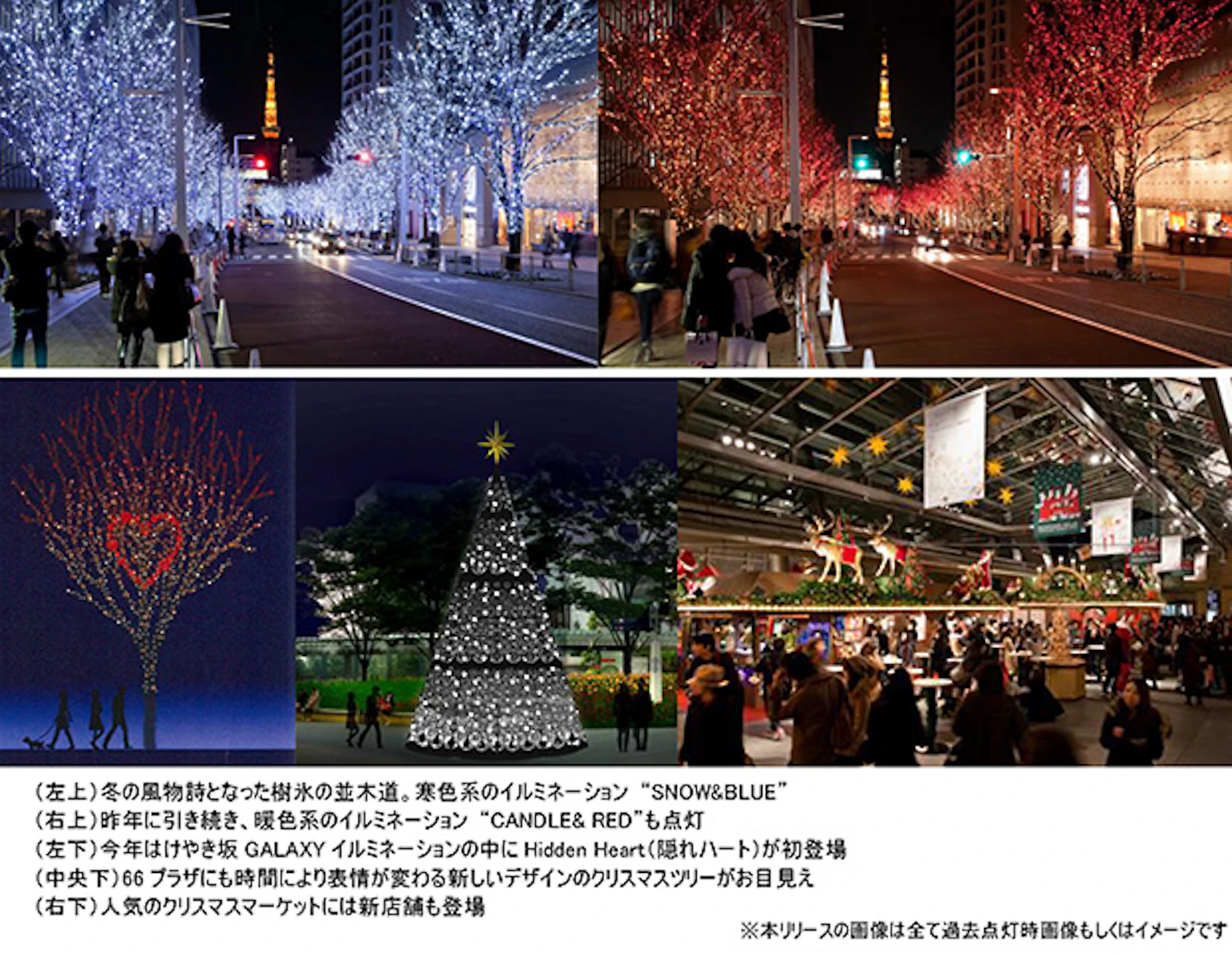 約400mの並木を彩るけやき坂GALAXYイルミネーションは、約110万灯のLEDの放つ眩い光が街を包みます。今年は新しい演出として、直径2mのHidden Heart(隠れハート)を2箇所に設置し、1時間につき数回ずつ点灯する予定です。