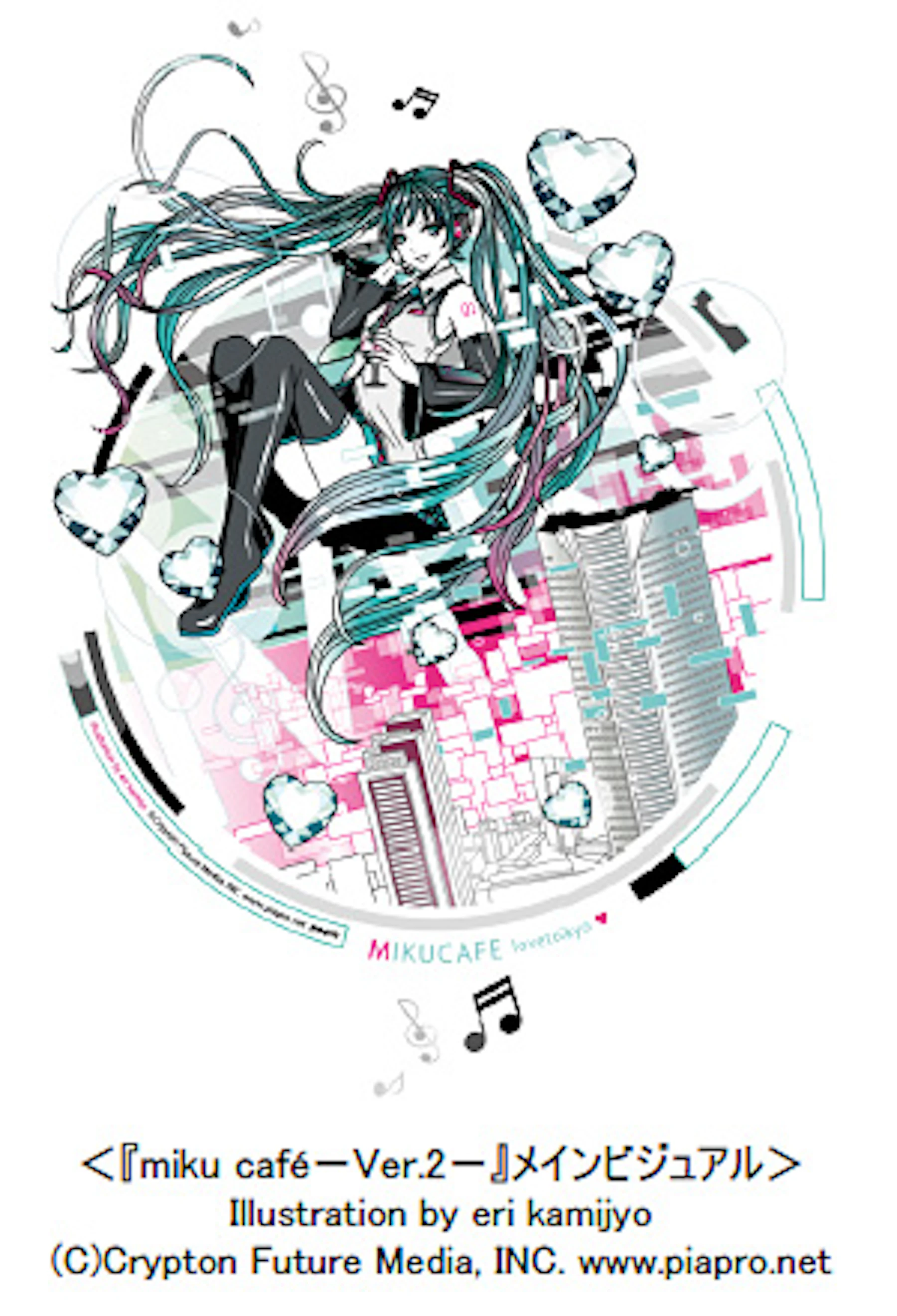 六本木ヒルズ展望台 東京シティビューでは、6月27日(木)まで、六本木ヒルズ開業10周年を記念して、森美術館で開催している「LOVE展:アートにみる愛のかたちーシャガールから草間彌生、初音ミクまで」の関連イベントとして、初音ミク仕様のカフェ『miku cafe』(ミク カフェ)を開催中です。