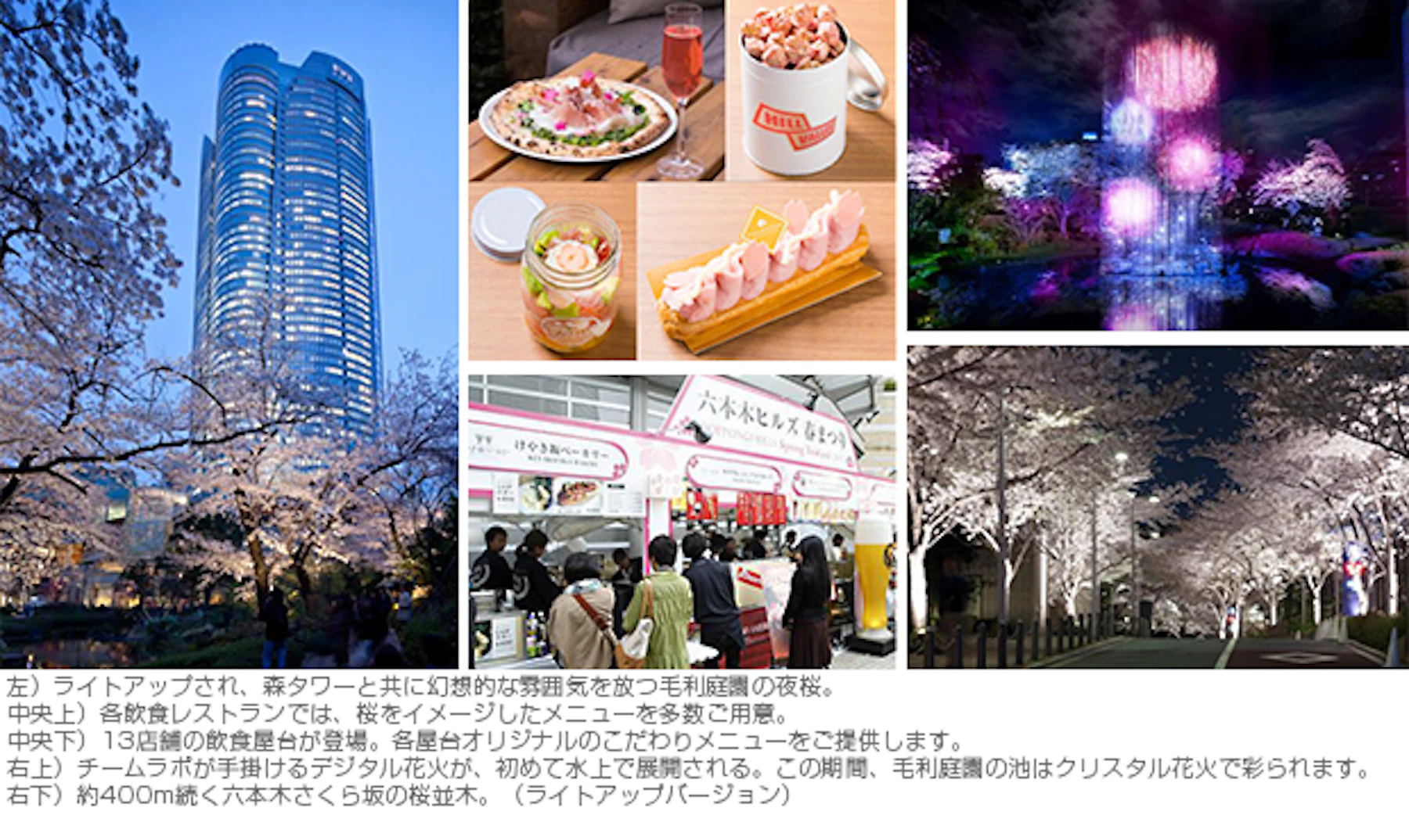 ソメイヨシノや枝垂れ桜が花を咲かせる「毛利庭園」、約400mの桜並木が続く「六本木さくら坂」では、桜の開花に合わせてライトアップを実施。