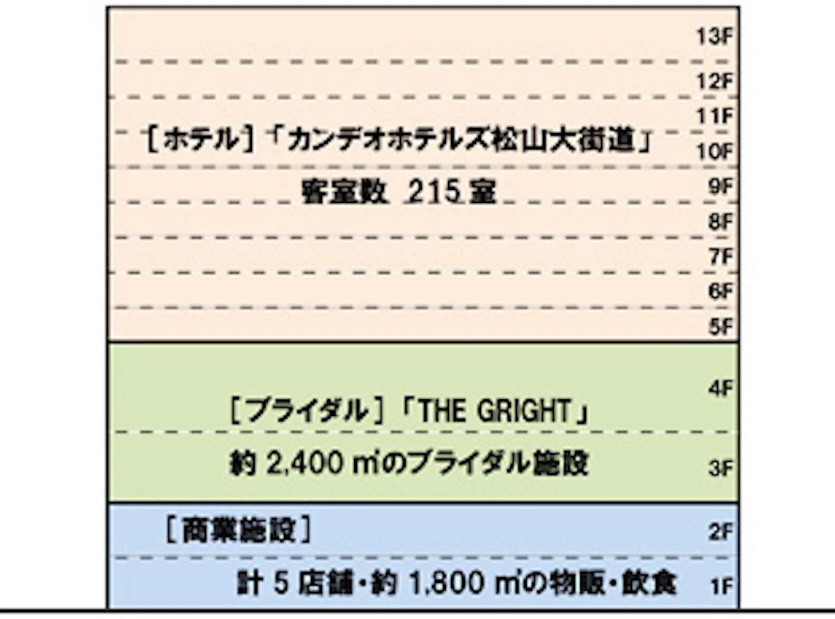 施設用途:1~2階 商業施設、3~4階 ブライダル、5~13階 ホテル
