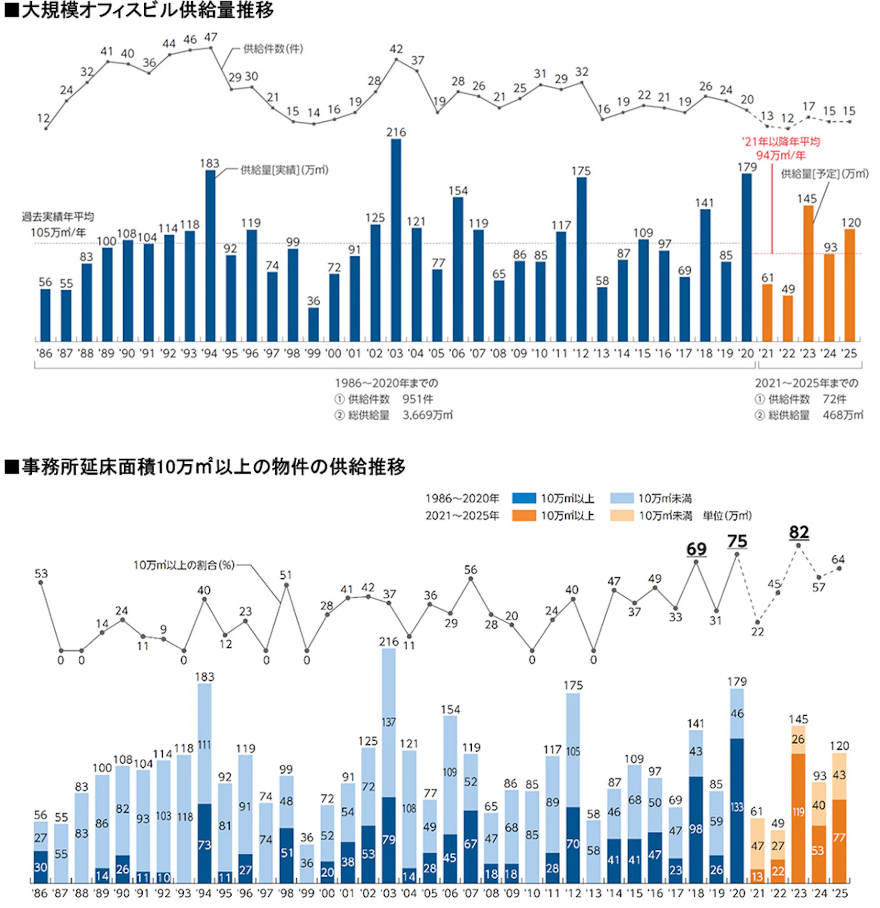 森ビル株式会社(東京都港区 代表取締役社長 辻慎吾)では、東京23区内で1986年以降に竣工した事務所延床面積10,000m²以上のオフィスビル(以下「大規模オフィスビル」)を対象に、需給動向に関する調査を1986年から継続して行っております。この度、2021年版の調査結果がまとまりましたので、ご報告いたします。