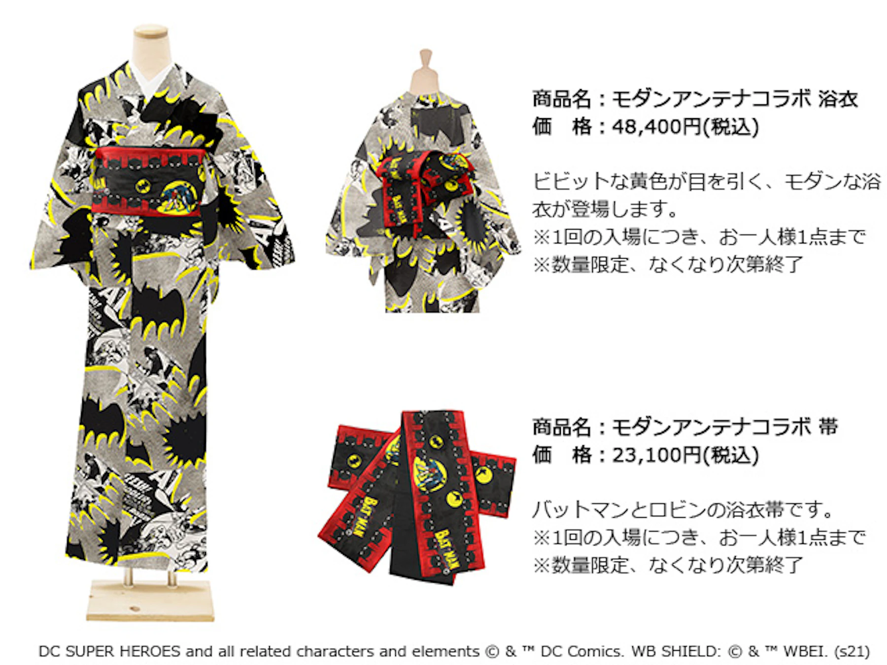 人気ブランドとのコラボレーションによる浴衣、キャップ、Tシャツ、トートバッグなど、DCをモチーフにデザインした、おしゃれなアイテムが続々登場。展覧会記念発売グッズの一部をご紹介します。