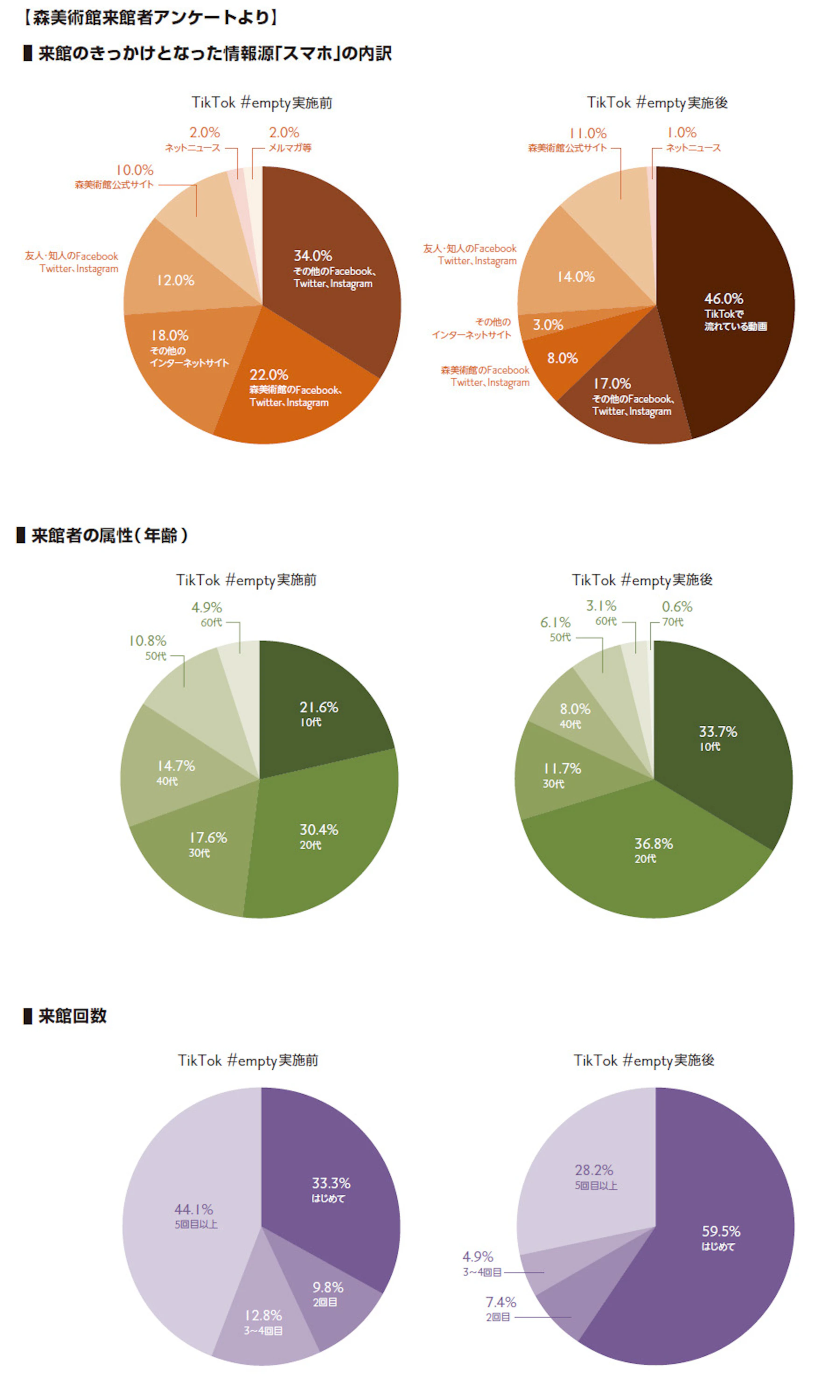 来館者へのアンケートによれば、#emptyの実施後、来館のきっかけとなった情報源を「スマホ」と回答した人のうち46%が「TikTokの投稿動画を見て」と回答しています。また、年齢属性では実施前はTikTokユーザー層である10代、20代があわせて52%であったのに対し、実施後は70%を超える状況となりました。さらに、森美術館に初めて来館した人は、実施前は33.3%、実施後は59.5%と倍増しました。