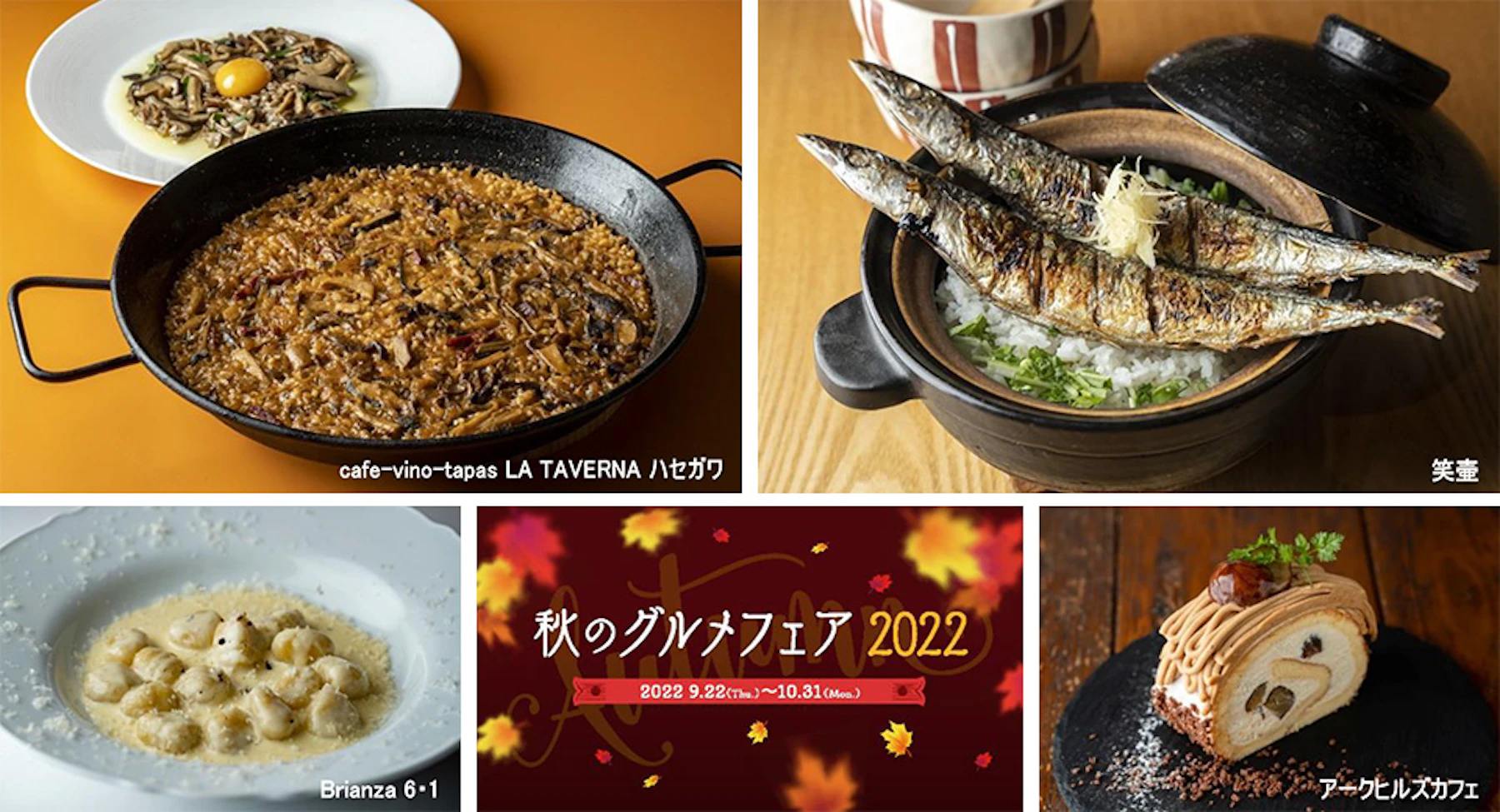 今回のフェアでは、7種類のきのこを使った「cafe-vino-tapas LA TAVERNA ハセガワ」のポルチーニ入りいろいろきのこのパエリアや、脂がたっぷりのったさんまの塩焼きを丸ごと2本のせた「笑壷」のさんま土鍋ごはん、さつまいもを使ったニョッキとゴルゴンソーラチーズが絡み合う「Brianza 6・1」のさつまいものニョッキ ゴルゴンゾーラチーズのクリームソースなど、秋に旬を迎える様々な食材がバリエーション豊かな世界の料理にアレンジされて登場します。そのほかにも、栗やカボチャ、紫いもなどを使ったスイーツも用意しています。