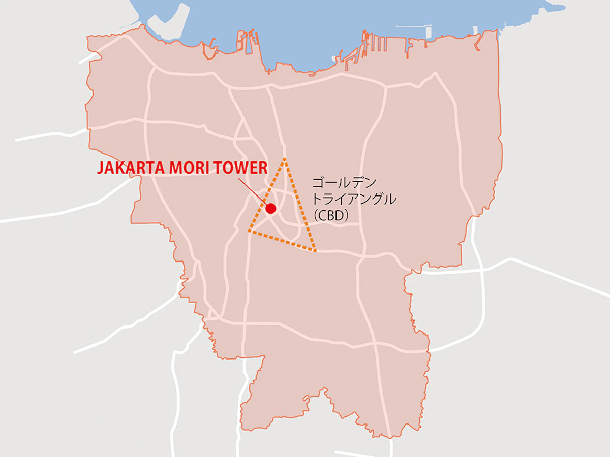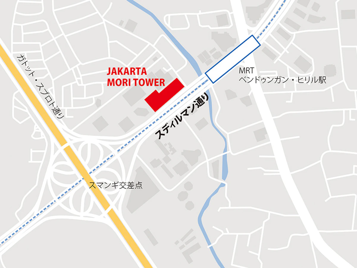 「JAKARTA MORI TOWER」は、高層ビルが集積するジャカルタ最大のビジネス街の中心部、目抜き通り・スディルマン通り沿いのスマンギ交差点近くに位置する、ジャカルタ最高水準のスペックを備えた大規模オフィスタワーです。