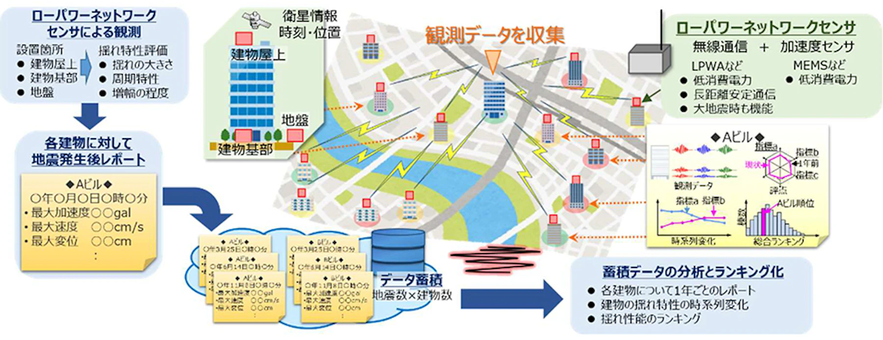 「土地建物格付けシステム」は、多数の地盤と建物に設置されたローパワーネットワークセンサを通じて地震発生時の揺れ特性に関する観測データを収集し、各建物の揺れ性能を分析・格付けすることで、都市全体の震災リスクを見える化・定量化するシステムです。省電力かつ無線式の小型センサにより、地震時の地盤と建物の揺れを測定、得られたデータを独自のアルゴリズムによって解析することで、各建物の揺れ性能について定量評価と格付け(ランキング化)を実現します。本システムによる分析結果をもとに、各ビルの所有者や管理者などが適切な震災対策を実施することで、都市全体の震災リスクの低減に貢献します。