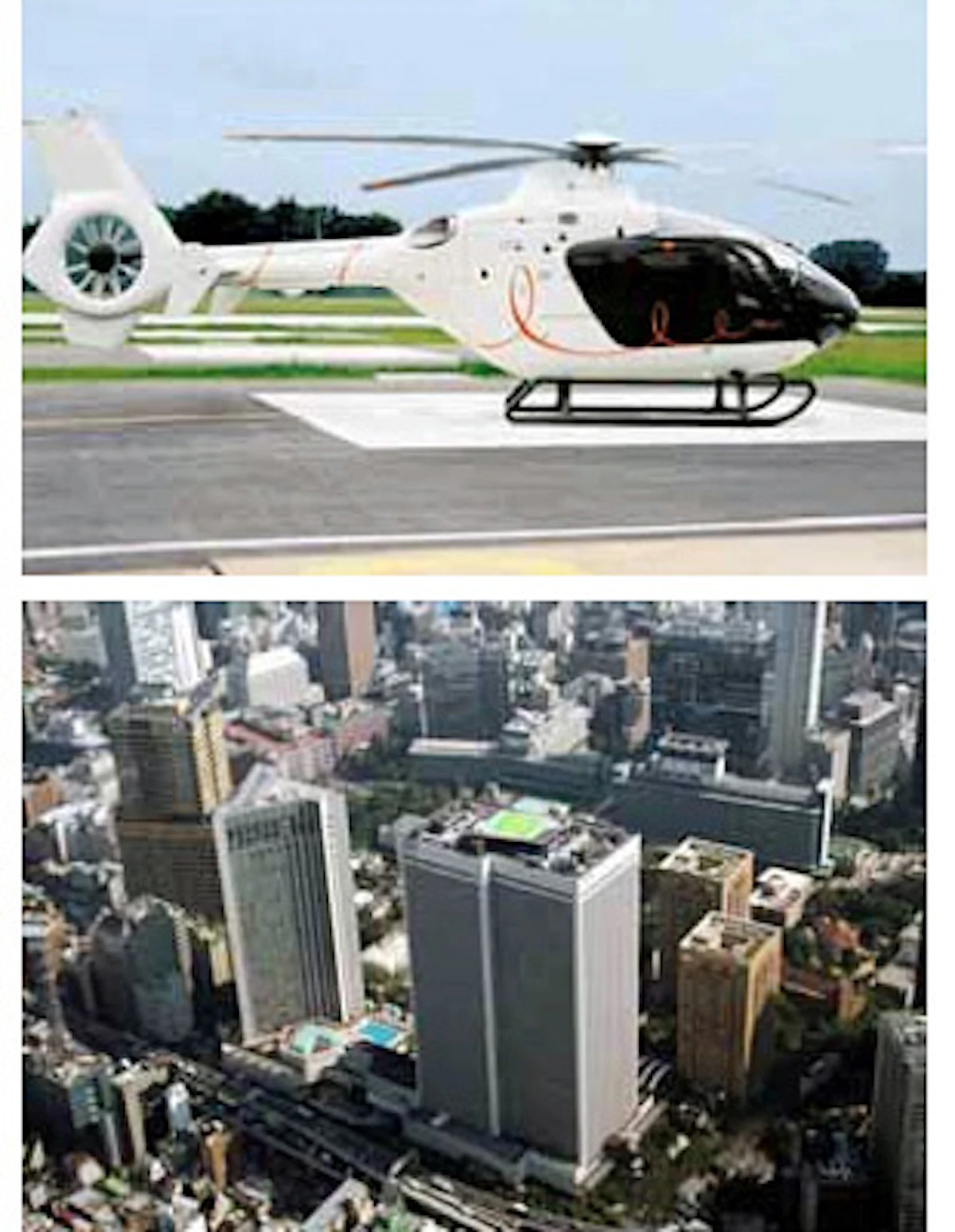 (*)Currently an application for a license to operate this service has been submitted to the Tokyo Regional Civil Aviation Bureau, the Ministry of Land, Infrastructure, Transport and Tourism by the helicopter transportation company Excel Air Service Inc., and service operation will commence subject to license approval. Service Features ![]() 1 ) ARK Hills Heliport in Akasaka is the only heliport to provide private helicopter service in central Tokyo. 2 ) Travel time between ARK Hills (Akasaka) and Narita International Airport is reduced to approx. 30 minutes. |