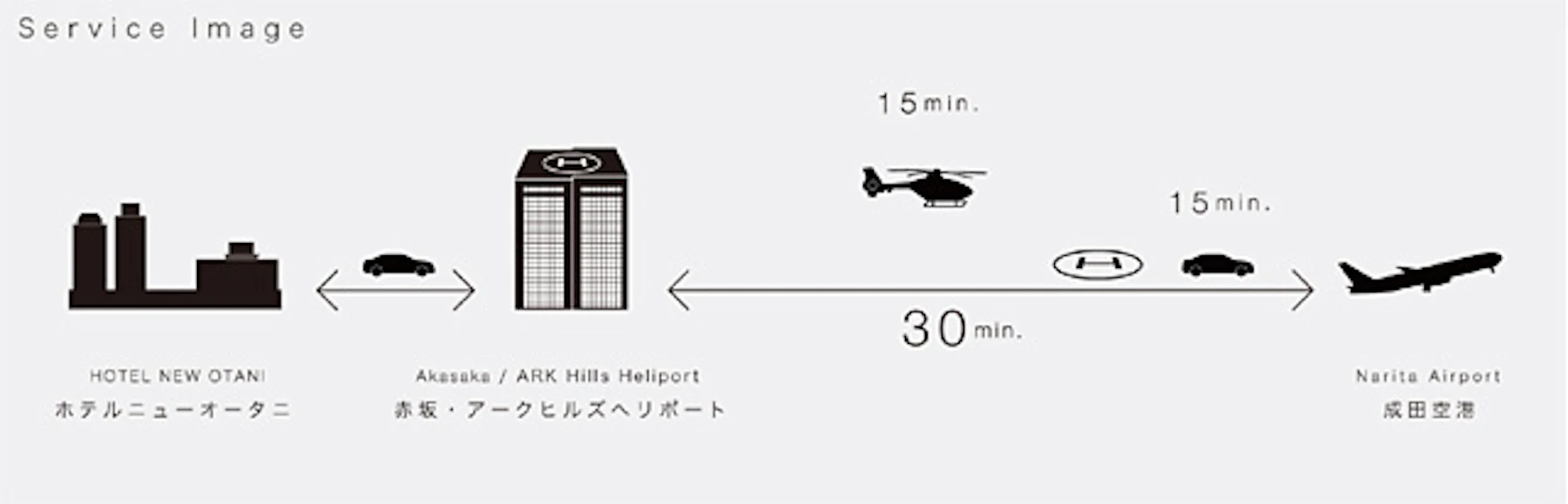 This service is operated by the MCAS "Narita Airline Connection Service" which connects ARK Hills Heliport in Akasaka with Narita Airport in 30 minutes by helicopter and limousine.
