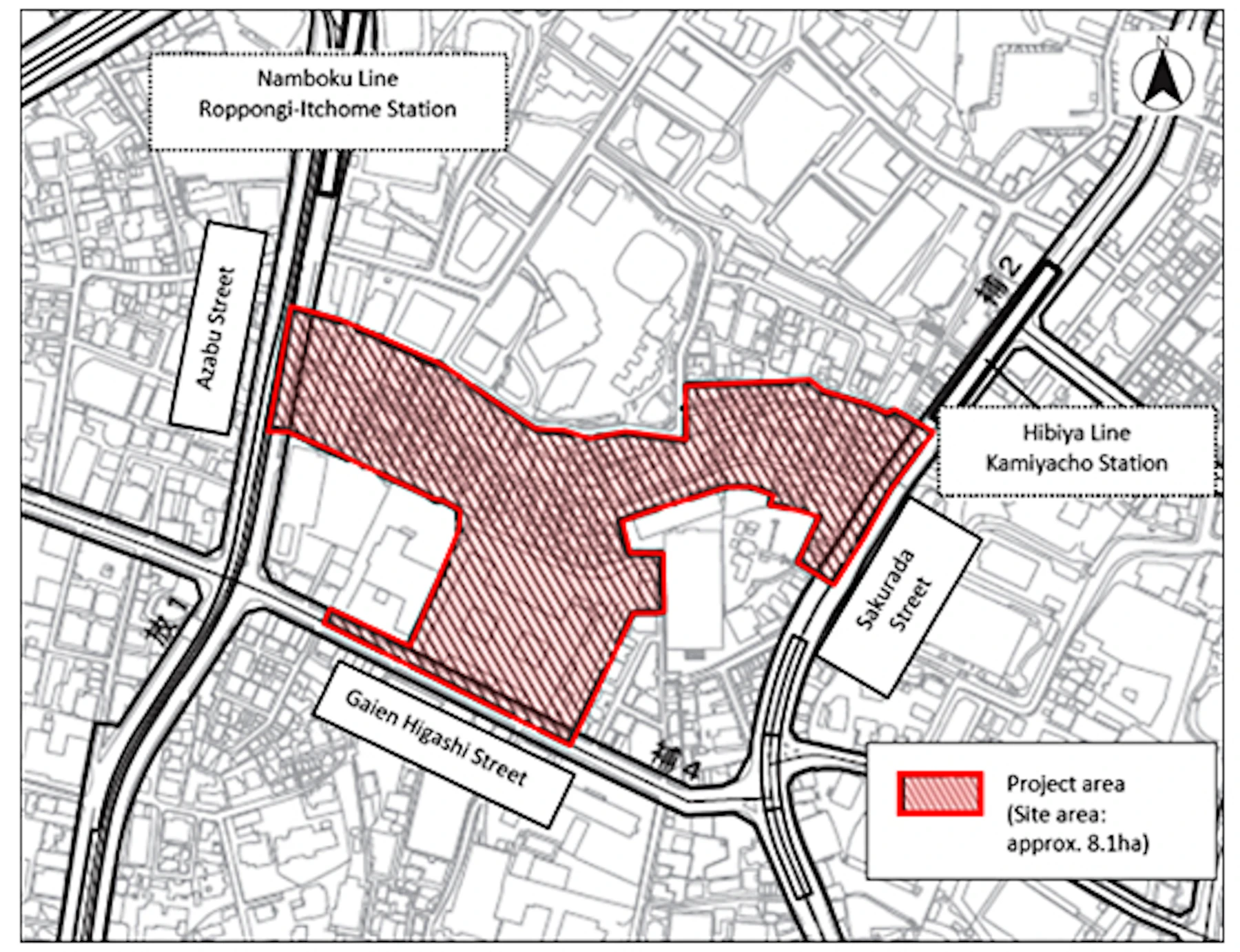 The 8.1-hectare site area of this project straddles the Toranomon 5-chome, Azabudai 1-chome and Roppongi 3-chome districts in Tokyo's Minato ward. Located between Kamiyacho Station on the Tokyo Metro Hibiya Line and Roppongi 1-chome Station on the Namboku Line, it is in an area that has already witnessed several urban redevelopments, including adjacent ARK Hills Sengokuyama Mori Tower.