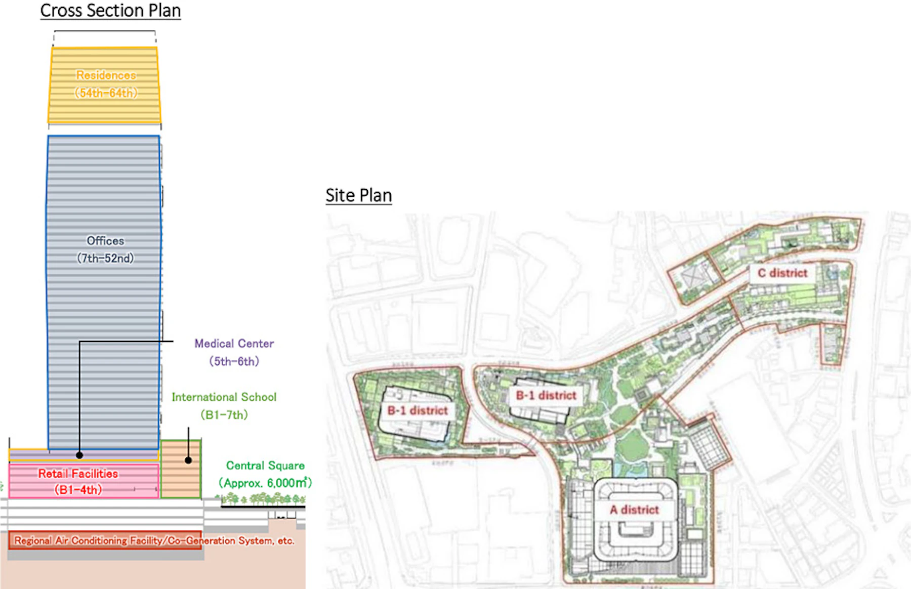 The Toranomon-Azabudai Project A District tower will offer large-scale office space with a total rental area of approximately 204,000m² and standard floor plate of approximately 4,300m². It will also feature the luxury branded Aman Residences, Tokyo, built in partnership with Aman, the operator of diverse world-class hotels and resorts. Other functions will include the Keio University Center for Preventive Medicine (tentative name), the British School in Tokyo, which will be one of the largest international schools in central Tokyo with approximately 700 students from over 50 countries, and large-scale retail facilities with a total floor area of approximately 13,000m².