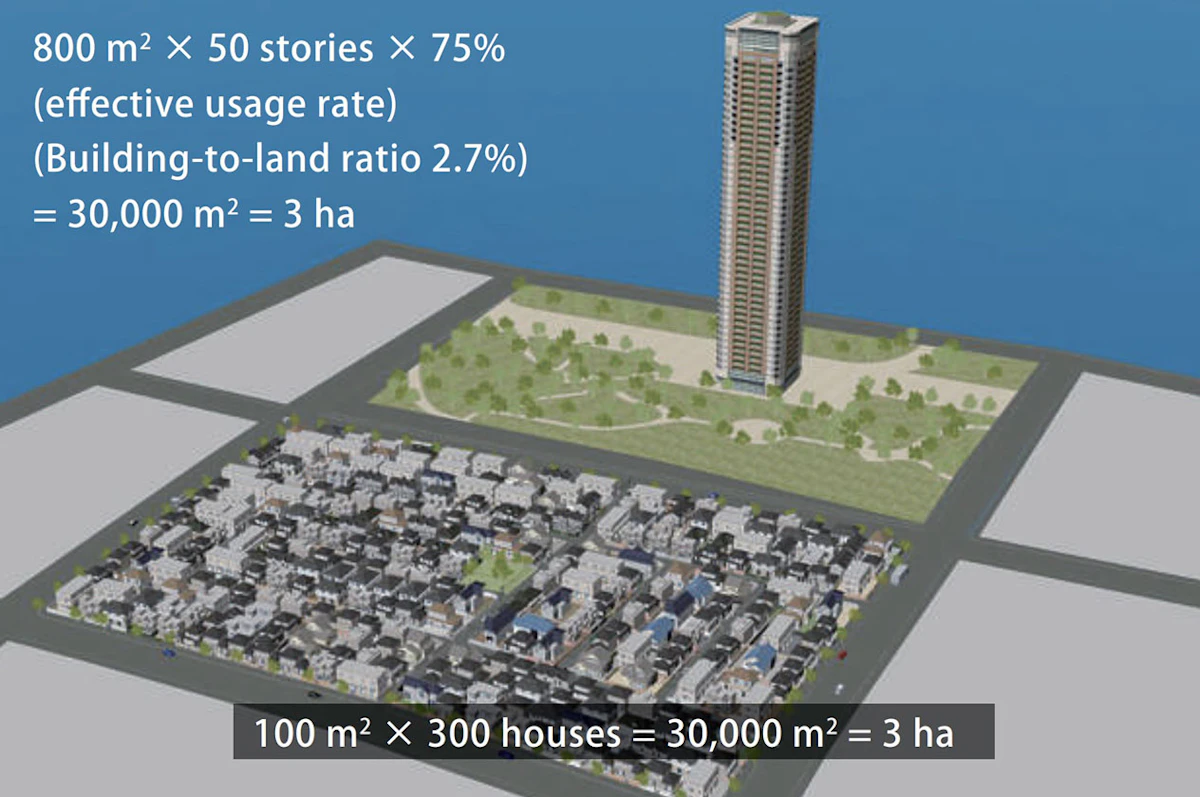 Furthermore, consolidating urban functions vertically decreases travel time for commuting and other purposes and increases free time. It also increases time for relaxation and the number of lifestyle options. A city where everything you need is in walking distance is also good for children and elderly. People with wheelchairs and strollers can get around comfortably and safely.