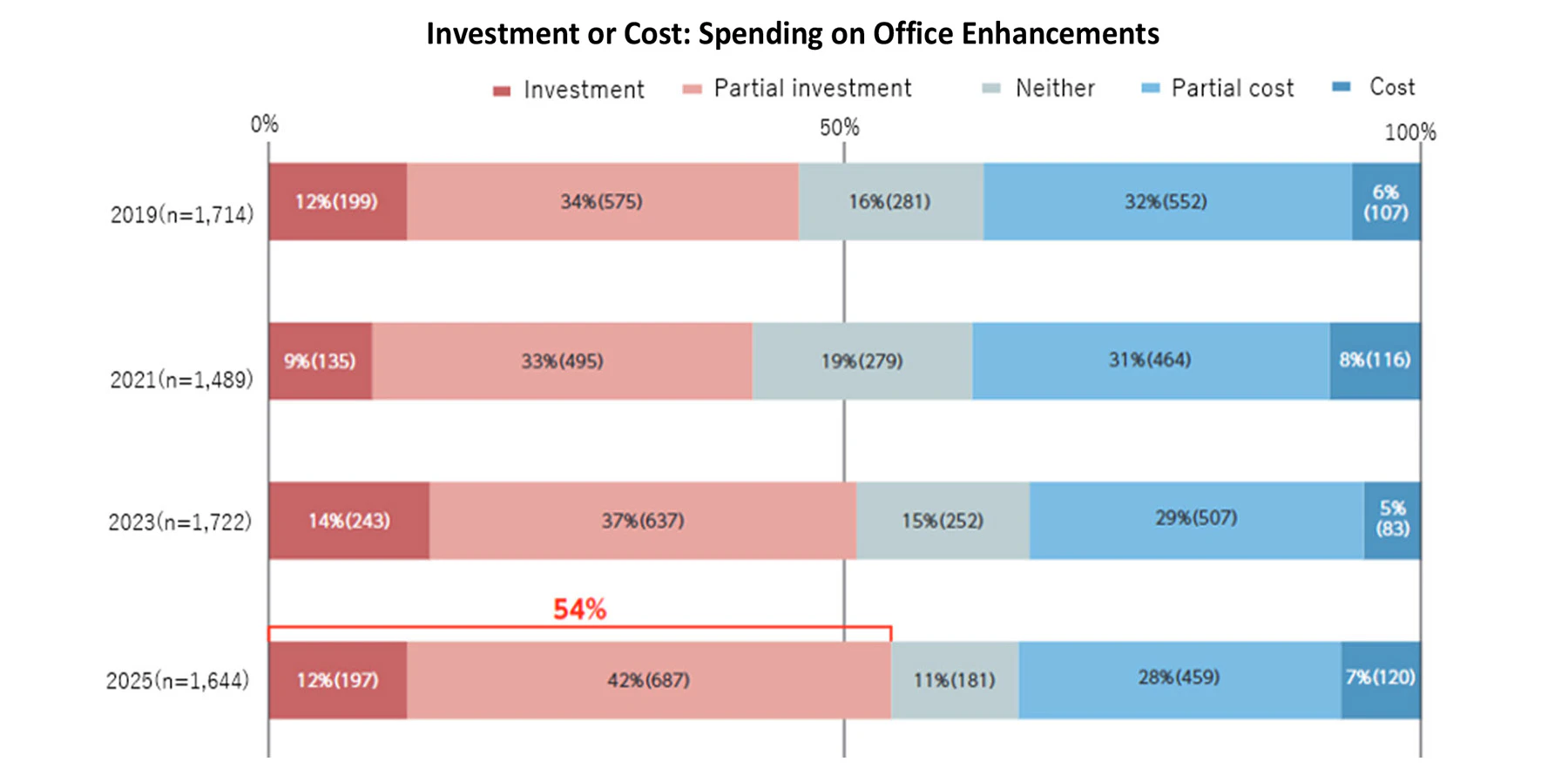 Regarding whether spending on office enhancements is considered an investment or a cost, 54% of respondents answered “investment” or “mostly an investment.” Among companies with 300+ employees, 66% gave the same answer.