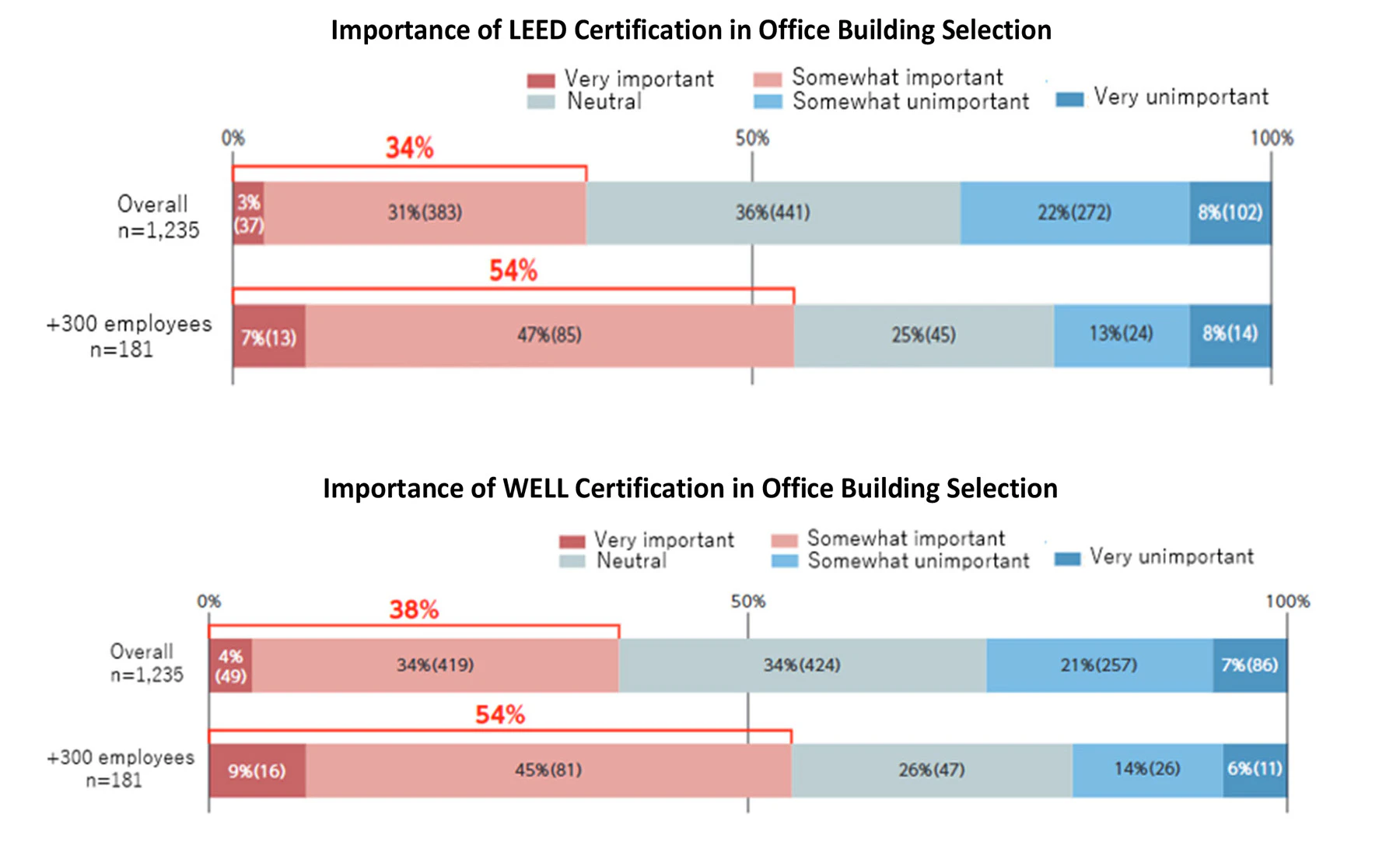 When asked about the importance of environmental and wellness certification systems, such as LEED and WELL, in selecting office buildings, around 30-40% of companies overall and over half of companies with 300+ employees responded that they “prioritize” such certifications. Among these respondents, 71% cited “To ensure comfortable and healthy office environments for employees,” indicating that companies regard comfort and employee well-being as an increasingly important considerations in office selection.