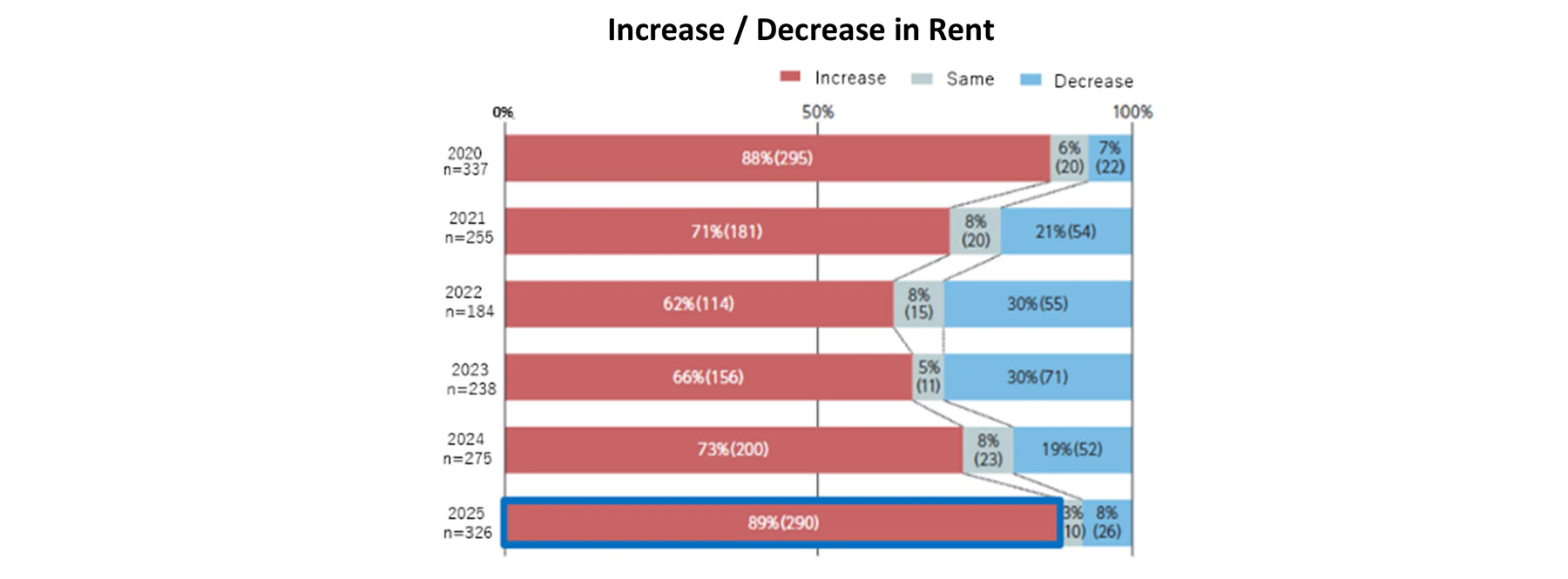 Among companies that have recently experienced a change in rent cost, those reporting an increase rose to 89%, the highest level in six years. In the coming year, around 40% said they would accept a 5-9% increase, while around 30% would accept an increase of 10% or more.