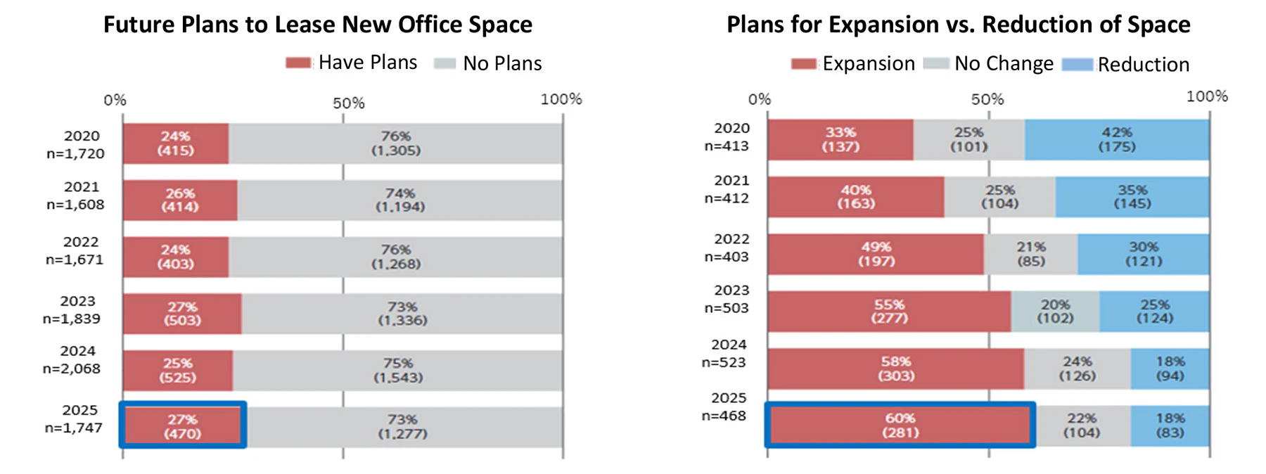 In the last three surveys combined (since 2023), the most common reason for planning to lease new space was “Better location,” followed by “Expand business/accommodate more employees,” and “Higher grade facilities.” Previously, reasons frequently cited during the three pandemic-era surveys (2020–2022), such as “Lower rent/lower priced building” and “Workplace changes due to new workstyles,” continued to decline.