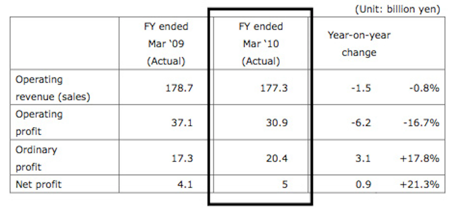 - Operating revenue for the fiscal year ended March 2010 declined slightly by 1.5 billion yen (-1%) from the previous year to 177.3 billion yen.