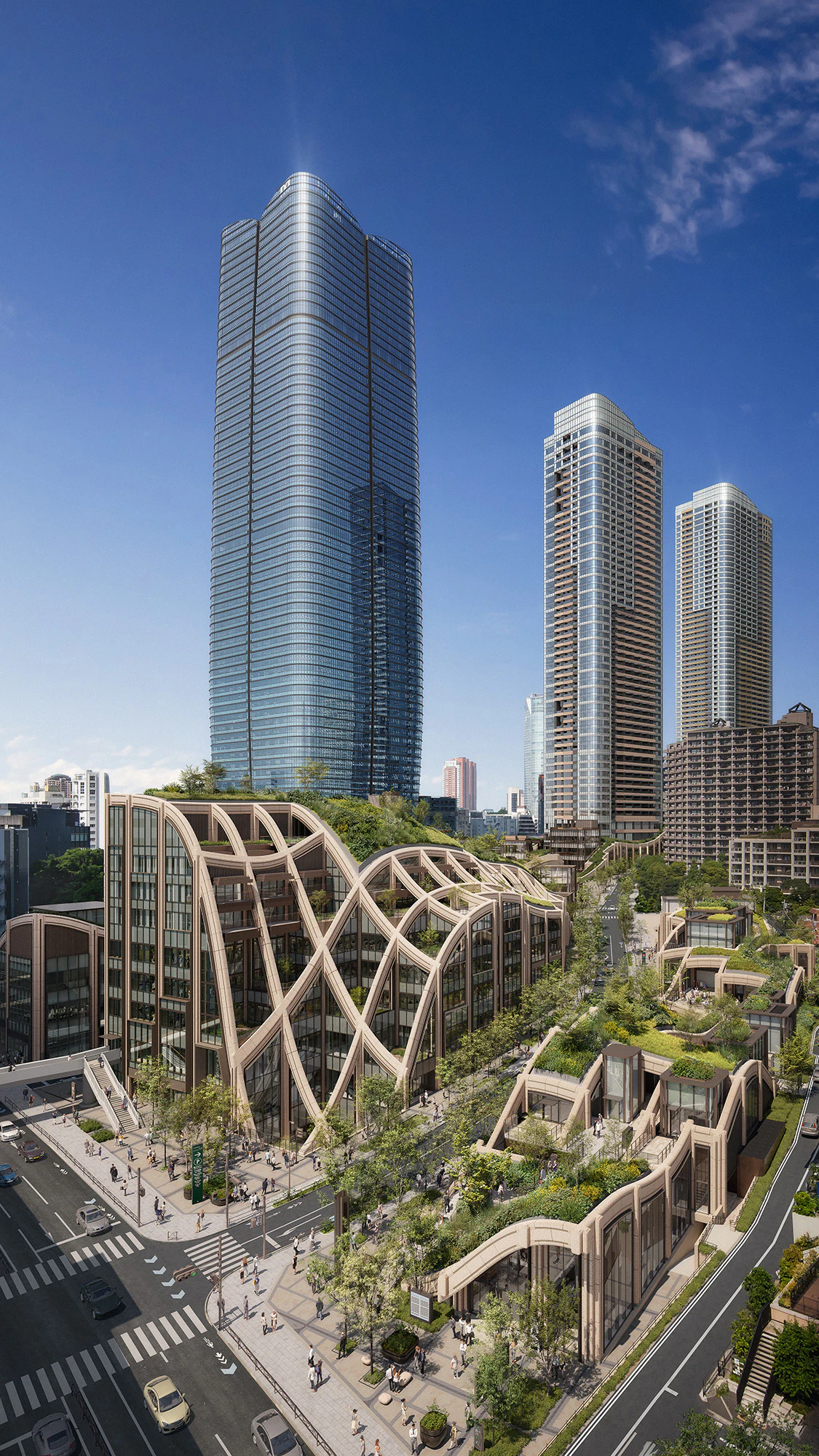 Public realm and lower-level architecture was created by Heatherwick Studio (UK) led by Thomas Heatherwick, a designer who has worked on many ingenious projects such as the Olympic Cauldron for the London 2012 Olympic Games. Azabudai Hills is the studio's first project in Japan to go into construction.