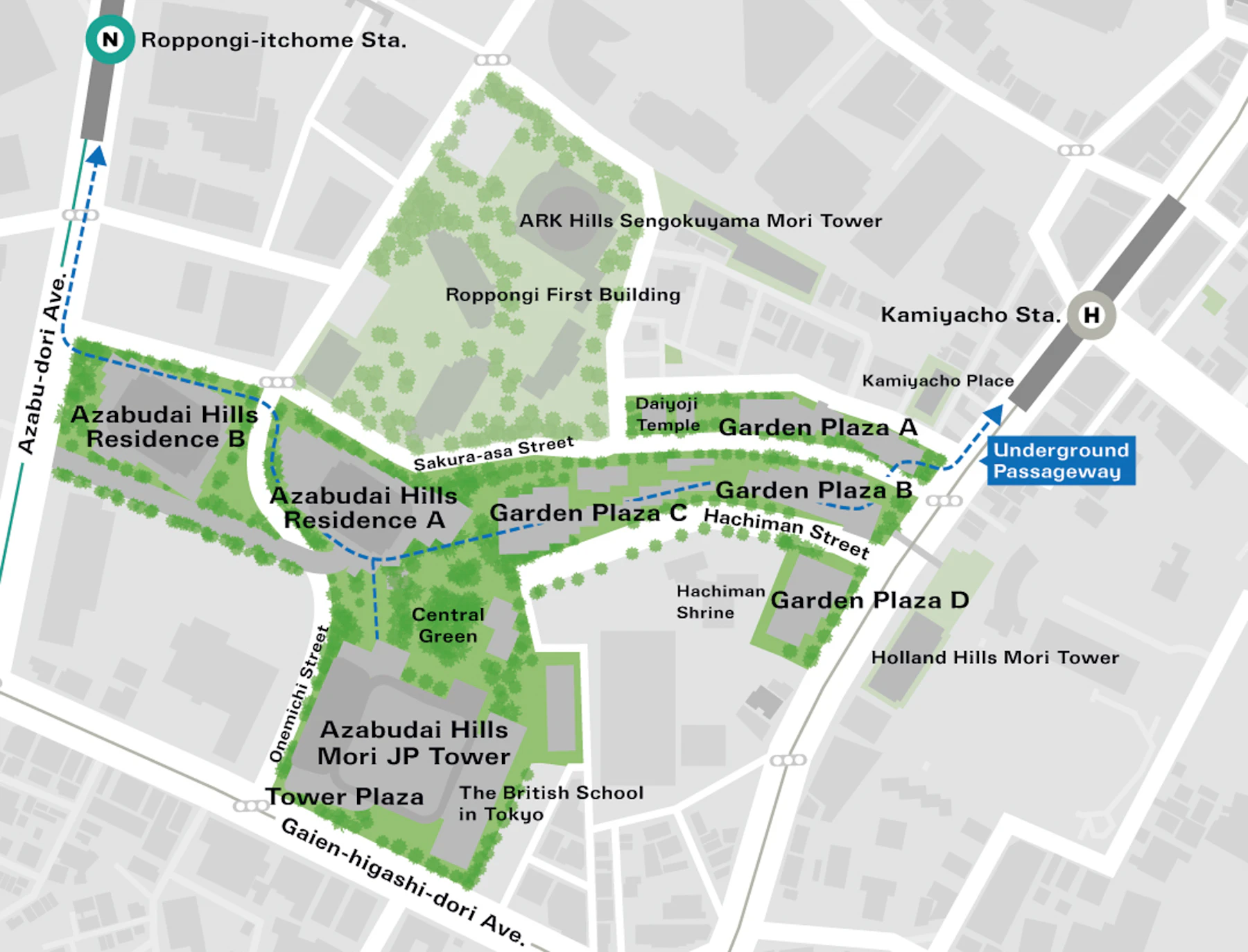 Although Azabudai Hills is well served by Sakurada-dori, Gaien-higashi-dori and Azabu-dori avenues on the area's perimeter, the original east-west roads were fragmented and the main north-south street, commonly known as Onemichi, did not merge with Gaien-higashi-dori, resulting in a highly inefficient traffic network that had plagued the area for decades.
