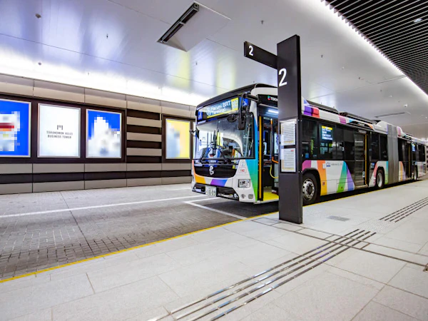 The first floor of the Toranomon Hills Business Tower encompasses a large (some 1,000m²) bus terminal directly accessible to/from Toranomon Hills Station on the Tokyo Metro Hibiya Line and Toranomon Station on the Tokyo Metro Ginza Line. The terminal is served by convenient airport limousine buses and the Tokyo Bus Rapid Transit (BRT) connecting central Tokyo and the waterfront area. Toranomon Hills Station Tower, closely integrated with Toranomon Hills Station on the Hibiya Line, is Tokyo Metro's first new station in 56 years. It features a lively open station plaza and a pedestrian deck above Sakurada-dori Avenue (National Route 1), measuring spacious 20 meters in width, which connects to Mori Tower's Oval Square.