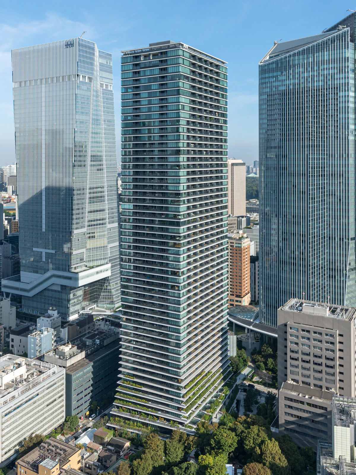 The exterior was designed to blend harmoniously with the existing Toranomon Hills Mori Tower and Toranomon Hills Business Tower as well as with the pedestrian deck and extensive greenery in adjacent Atagoyama, making it a landmark worthy of an international hub representing Tokyo. It creates a space that integrates Japanese aesthetics, which emphasizes harmony with others and nature, and international lifestyles.