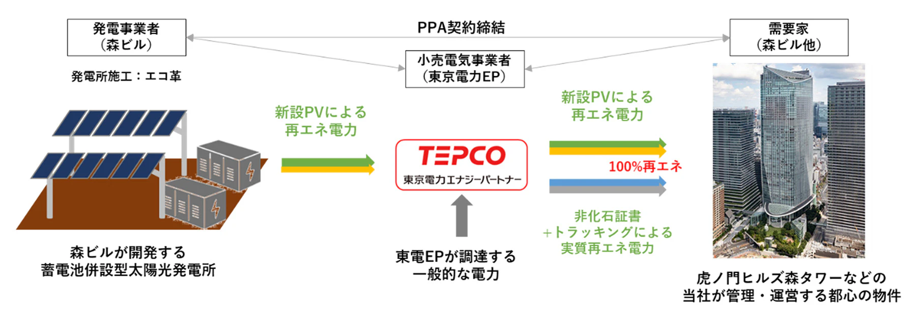 今回運転を開始する栃木県栃木市(1施設)と茨城県日立市(2施設)の合計発電容量は約7,200kW、蓄電池容量は約11,000kWhであり、年間想定発電量は約1,000万kWh(一般家庭約2,500世帯相当※2)を見込んでいます。これは国内で運転中の蓄電池併設型太陽光発電所のなかでも非常に大規模なもので、発電した再エネ電力は、オフサイトコーポレートPPA※3を活用した供給プランを用いて、虎ノ門ヒルズ森タワーをはじめ当社が管理・運営する都心部の物件に供給します。
