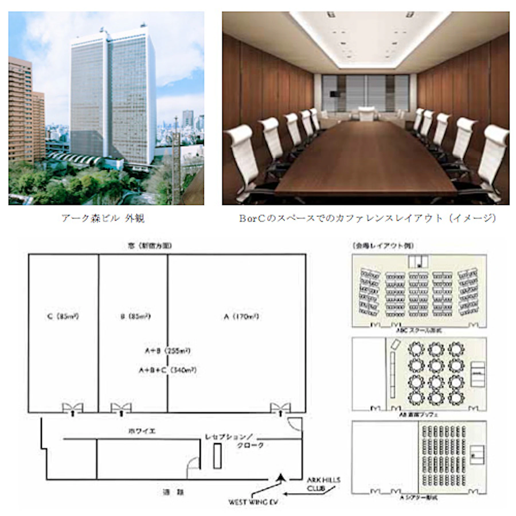 施設面積:the club room ABC全室 340m²(A:170m² B:85m² C:85m²)