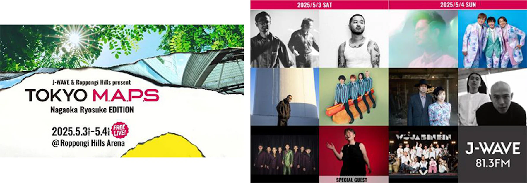 森ビル株式会社が運営する六本木ヒルズ(東京都港区、代表取締役 辻 慎吾)は、ゴールデンウィークの5月3日(土)、4日(日)の2日間、ラジオ局J-WAVE(81.3FM)と、フリーライブイベント「J-WAVE & Roppongi Hills present TOKYO M.A.P.S Nagaoka Ryosuke EDITION」を六本木ヒルズアリーナで共催します。