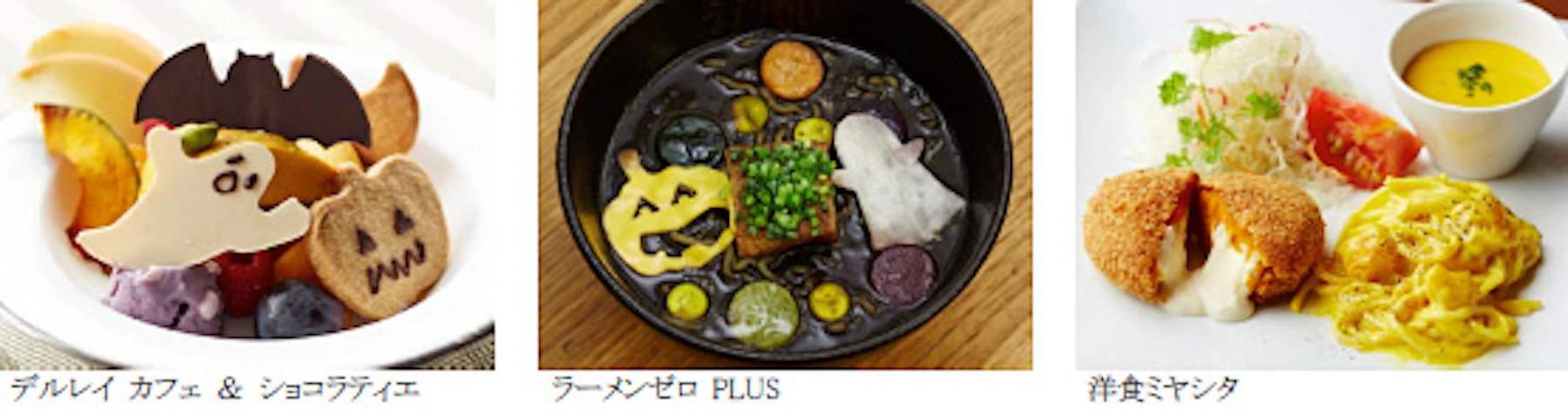 飲食店11店舗では、かぼちゃを使った限定メニューを提供します。ハロウィーンの夜をイメージした「ラーメンゼロ PLUS」の“黒い”味噌ラーメンや、かぼちゃのパスタ・コロッケ・スープが味わえる「洋食ミヤシタ」のパンプキン三昧プレートのほか、ハロウィーンモチーフのデコレーションが楽しい「デルレイ カフェ&ショコラティエ」の本格デザートなど、見た目にも味にもこだわった、表参道ヒルズならではの限定メニューをお楽しみ頂けます。