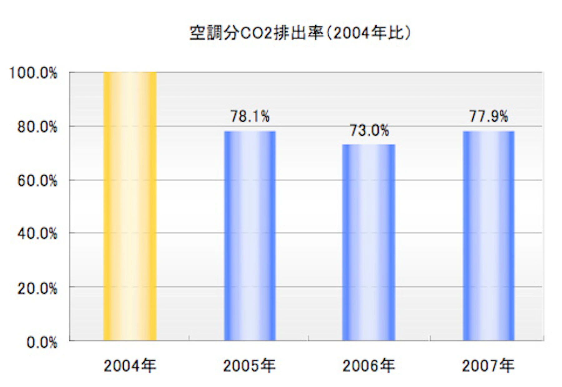 森ビルは、都市づくりの基本理念として「環境と緑」をミッションの一つに掲げ、地球環境に配慮したサステイナブルな都市の実現を目指しています。その一環として、夏のエアコン温度を高めに設定するクールビズの取組みを2005年より開始しました。2006年からは風量調整のチューニングによりファン動力の削減および除湿効果も得て、空調に関わるCO2排出量において2004年度比20%超(※)の削減を実現しています。