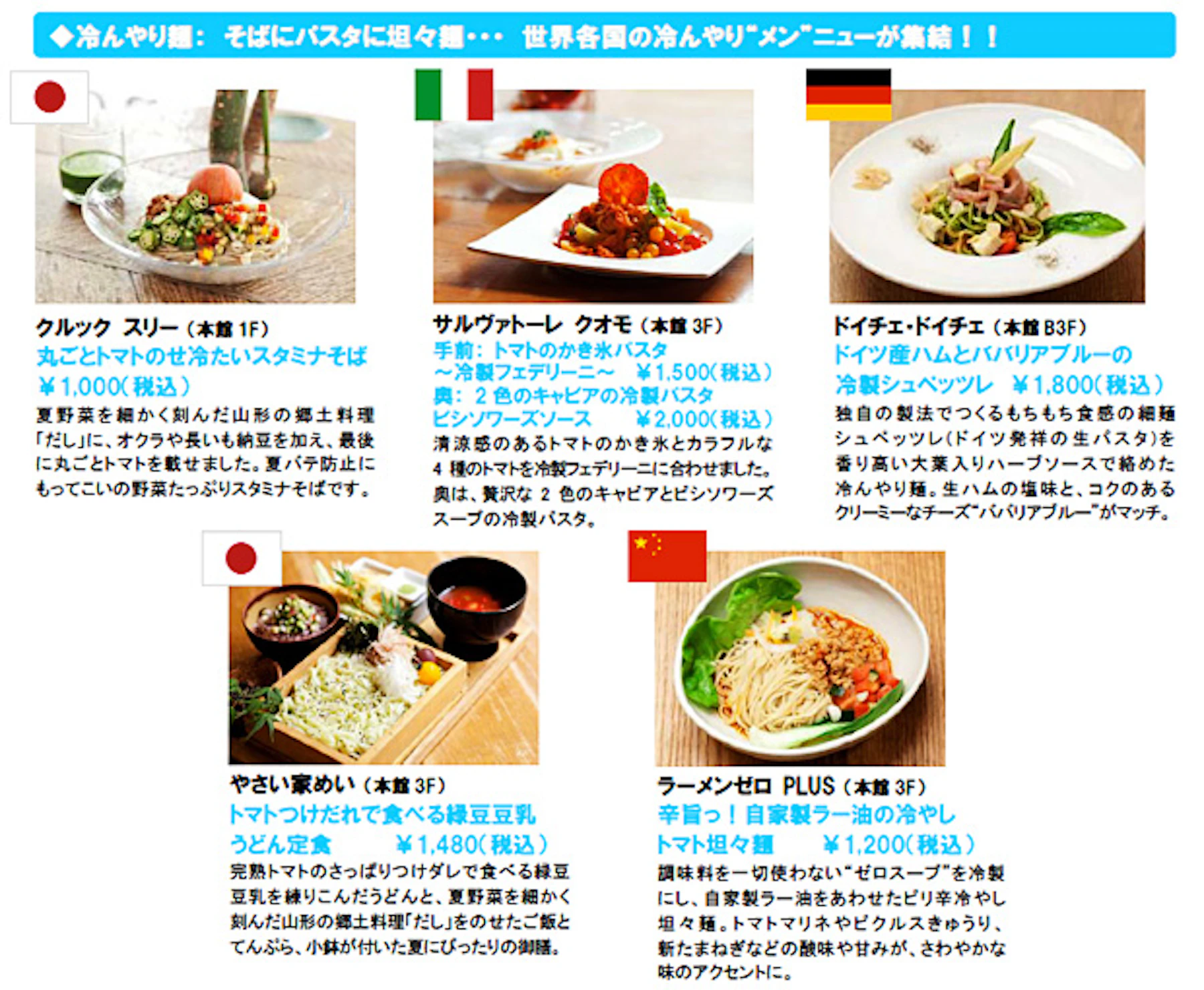 イタリアンレストランのサルヴァトーレ クオモ(本館3F)では、トマトのかき氷とカラフルな4種のトマトを組み合わせた冷製パスタを販売。“Made in Japan”を意識したカフェのクルック スリー(本館1F)では、夏野菜をふんだんに使用した夏バテ防止にもぴったりの冷たいそばを提供します。他にも、冷たい坦々麺やドイツの冷製生パスタなど、世界各国の冷んやり麺をお楽しみ頂けます。また、カフェ店舗には、猛暑にぴったりの爽やかデザートが登場。季節の食材を贅沢に使用したかき氷やパルフェなど、味だけでなく見た目にも楽しい清涼感たっぷりの冷んやりスイーツをご用意しています。