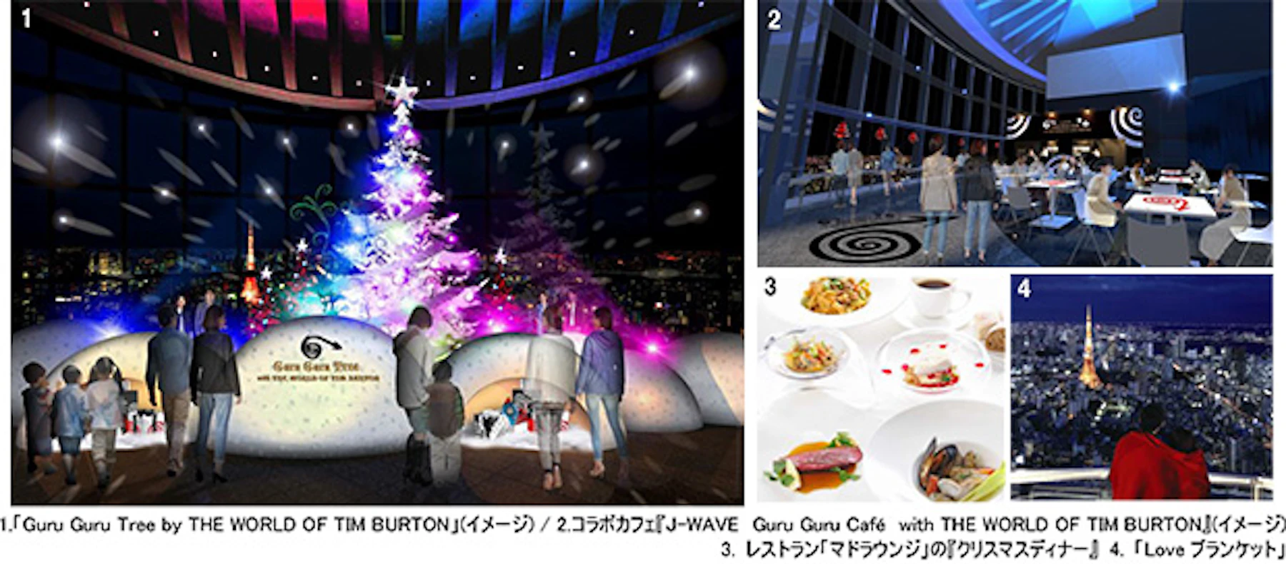 展望回廊内には、ティム・バートン監修の光り輝く不思議なクリスマスツリー「Guru Guru Tree by THE WORLD OF TIM BURTON」が登場。