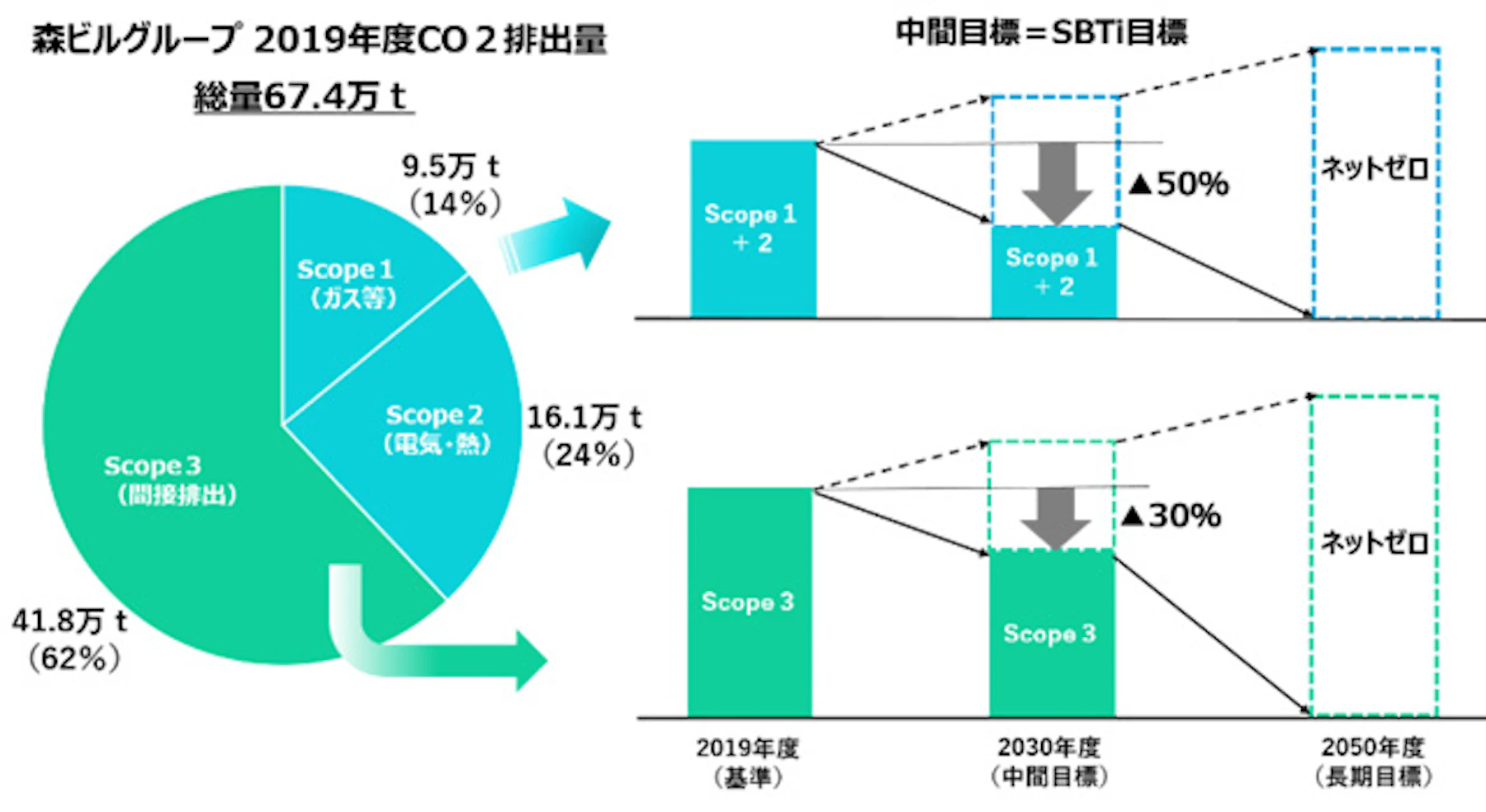 森ビル株式会社(東京都港区、代表取締役社長 辻慎吾)は、脱炭素社会の実現に向けて、森ビルグループ(連結対象)の事業活動に伴う温室効果ガス排出量をスコープ1及び2については2030年度に50%削減(2019年度比)、スコープ3については2030年度に30%削減(2019年度比)とし、2050年度までにネットゼロとする目標を設定いたしました。