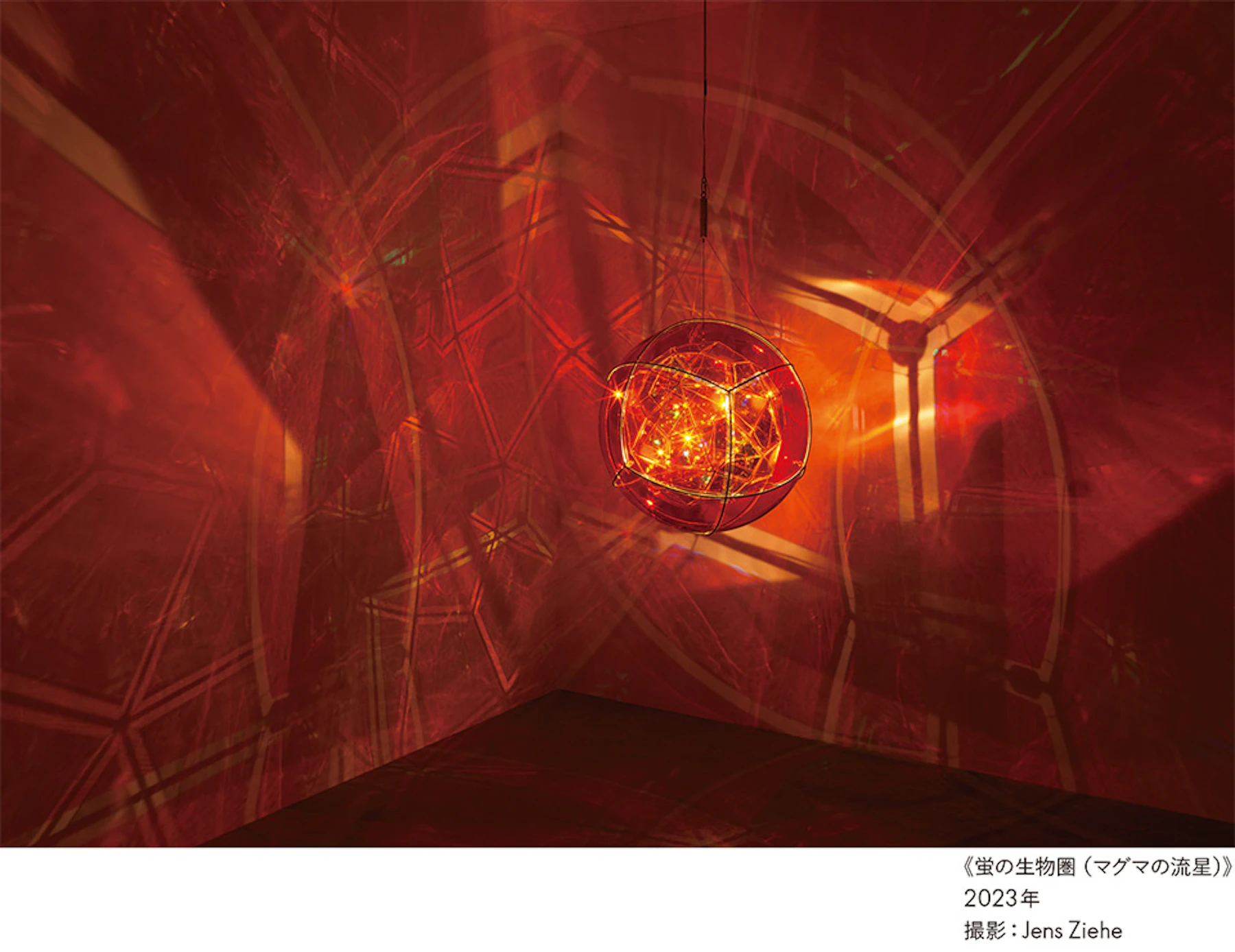 本展では、麻布台ヒルズの開業にあわせて制作された新作のパブリックアート《相互に繋がりあう瞬間が協和する周期》(2023年)で取り組んだ主題を軸に、新作インスタレーションや水彩絵画、ドローイング、立体作品を通し、線や振る舞い、動きなどのモチーフを探求します。光と水を使った大型インスタレーション《瞬間の家》(2010年)や、複雑に屈折する光を内包する幾何学立体の《蛍の生物圏(マグマの流星)》(2023年)、太陽光や風といった動力で描いた新作ドローイングなど、自然現象から幾何学、物理や動作パターン、色彩学に関する研究に裏付けられた、知覚に訴えかける作品群を紹介します。