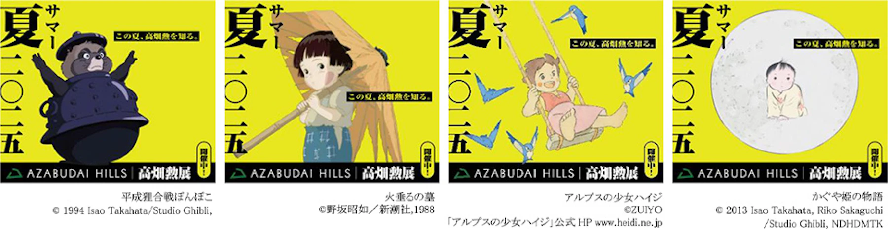 麻布台ヒルズ各所には、高畑勲の4作品を用いたコラボビジュアルが展開されるほか、『平成狸合戦ぽんぽこ』や『パンダコパンダ』など、高畑作品のワンシーンをイメージしたフォトスポットも登場。さらに、8月8日(金)から8月11日(月・祝)の期間に開催される「麻布台ヒルズ 納涼祭り 2025」では高畑勲展のチケットをお持ちの方に、『アルプスの少女ハイジ』のハイジまたはユキちゃんのお面を配布します。