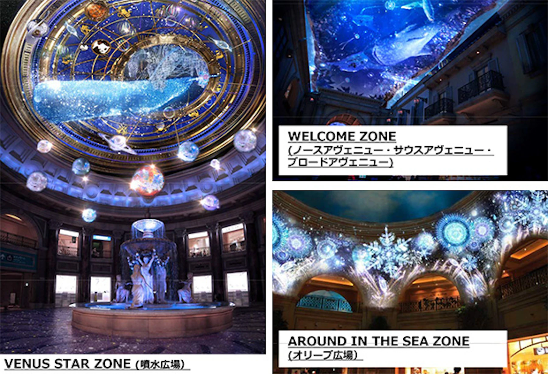 ヴィーナスフォートは、空を模した天井が1時間かけて朝~夕焼け~夜空へ変化する演出が特徴の商業施設です。当期間中はその“空”を使って、12時以降の毎時00分と30分から、クリエイティブカンパニー『NAKED Inc.』によるプロジェクションマッピング映像と音楽・照明がリンクした圧巻のショーを展開します。中世ヨーロッパの街並みを模した館内で、美しい星空と海の世界が融合したダイナミックかつ幻想的な世界観をお楽しみいただけます。