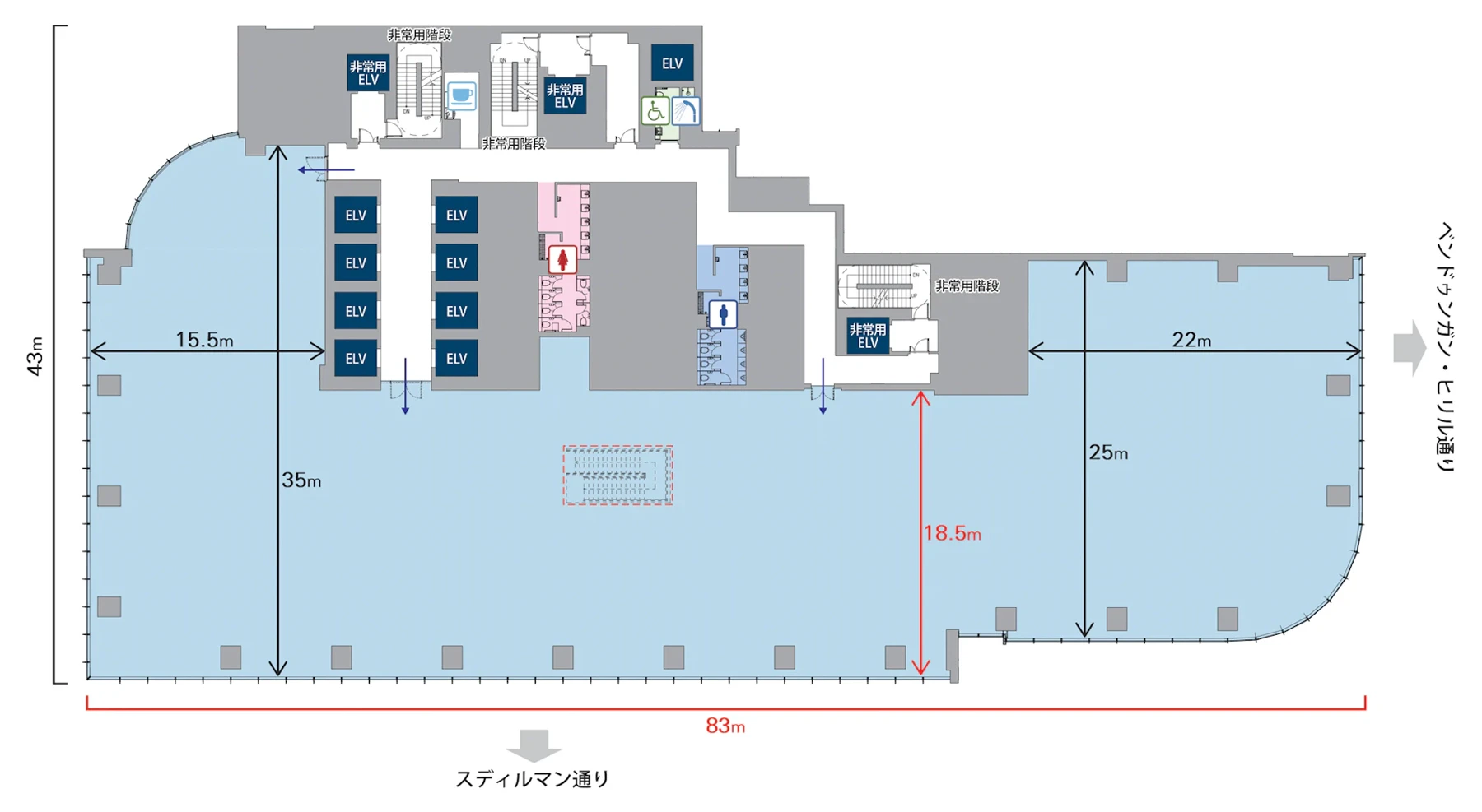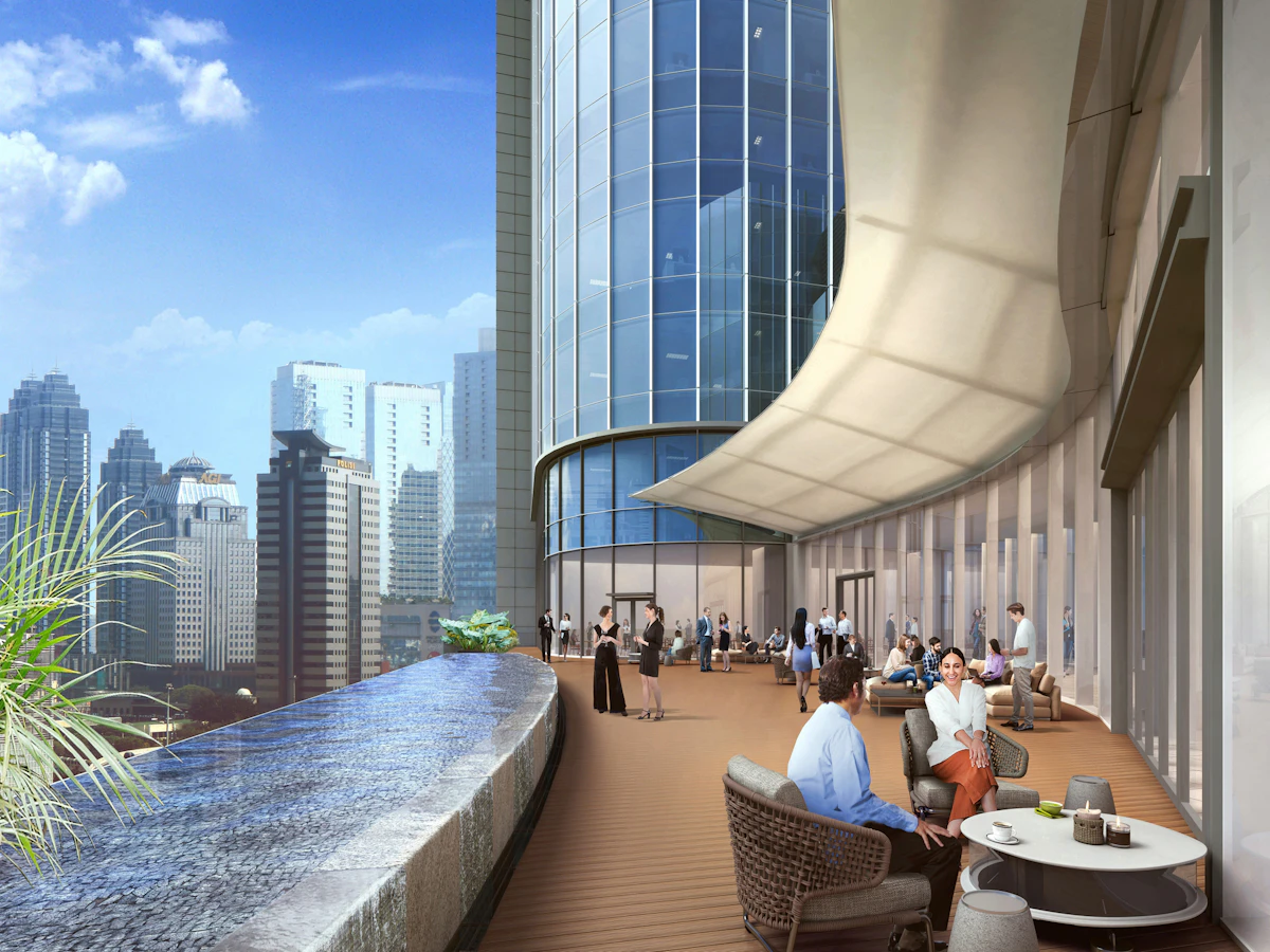 地上58階建て、高さ266m、延床面積は184,230m²。オフィスの総貸室面積は約88,700m²で、基準階貸室面積はジャカルタ最大規模のオフィスプレートとなる約2,300m²を確保しました。天井高3.0m、コアから窓面までの距離18.5mの広大で開放的な無柱空間は、グローバル企業の多様なニーズや、新たな働き方のスタイルに応じて自由なレイアウトが可能です。