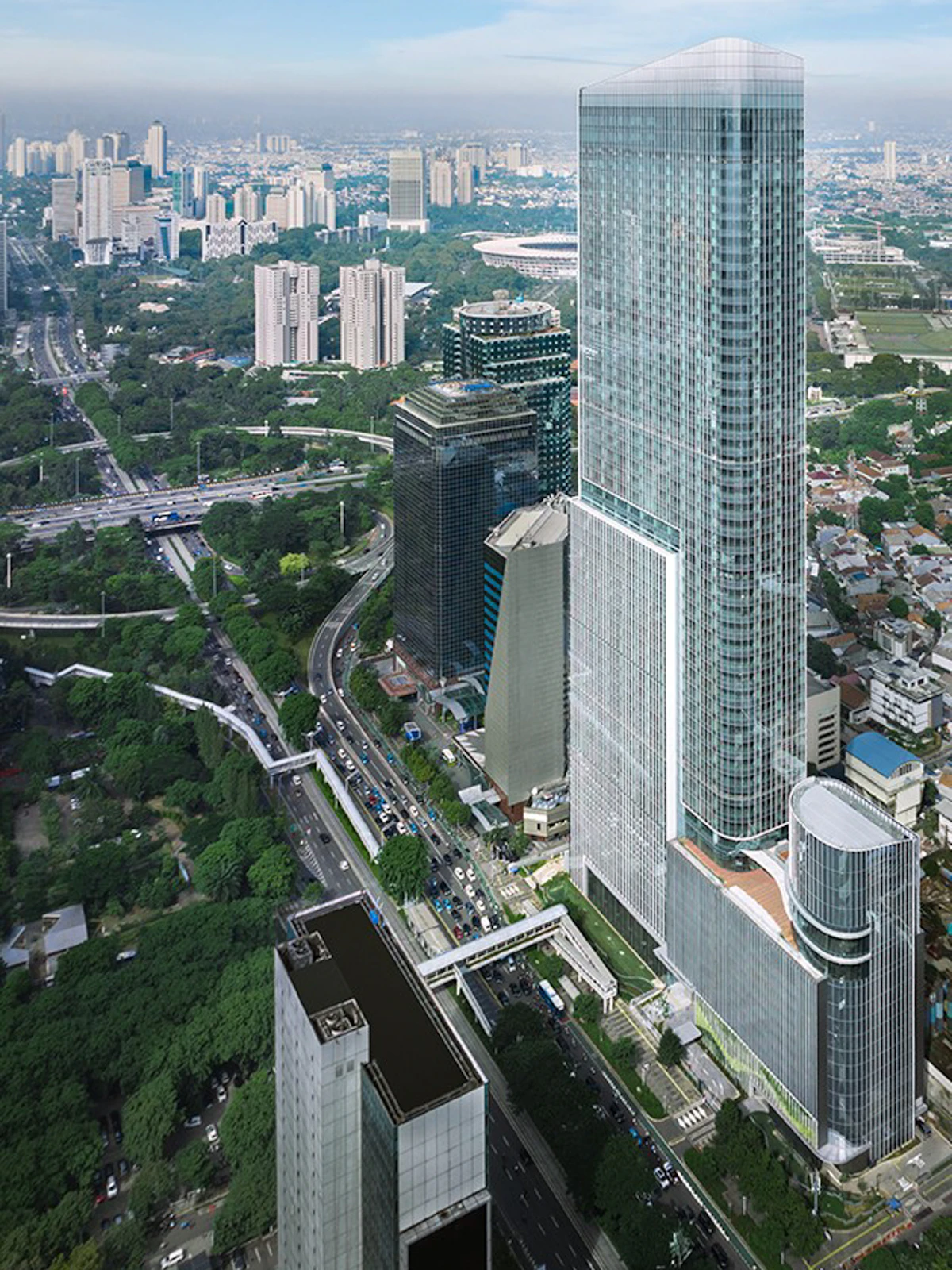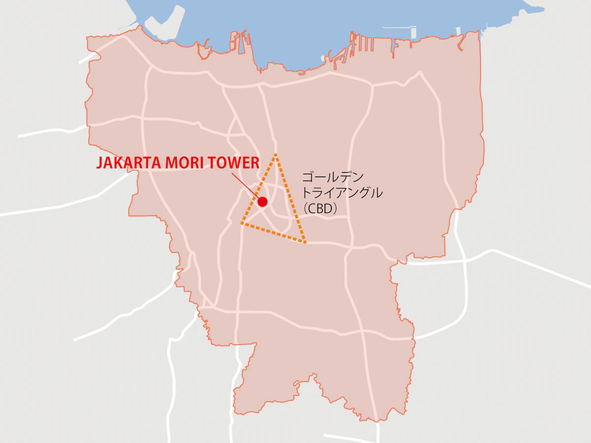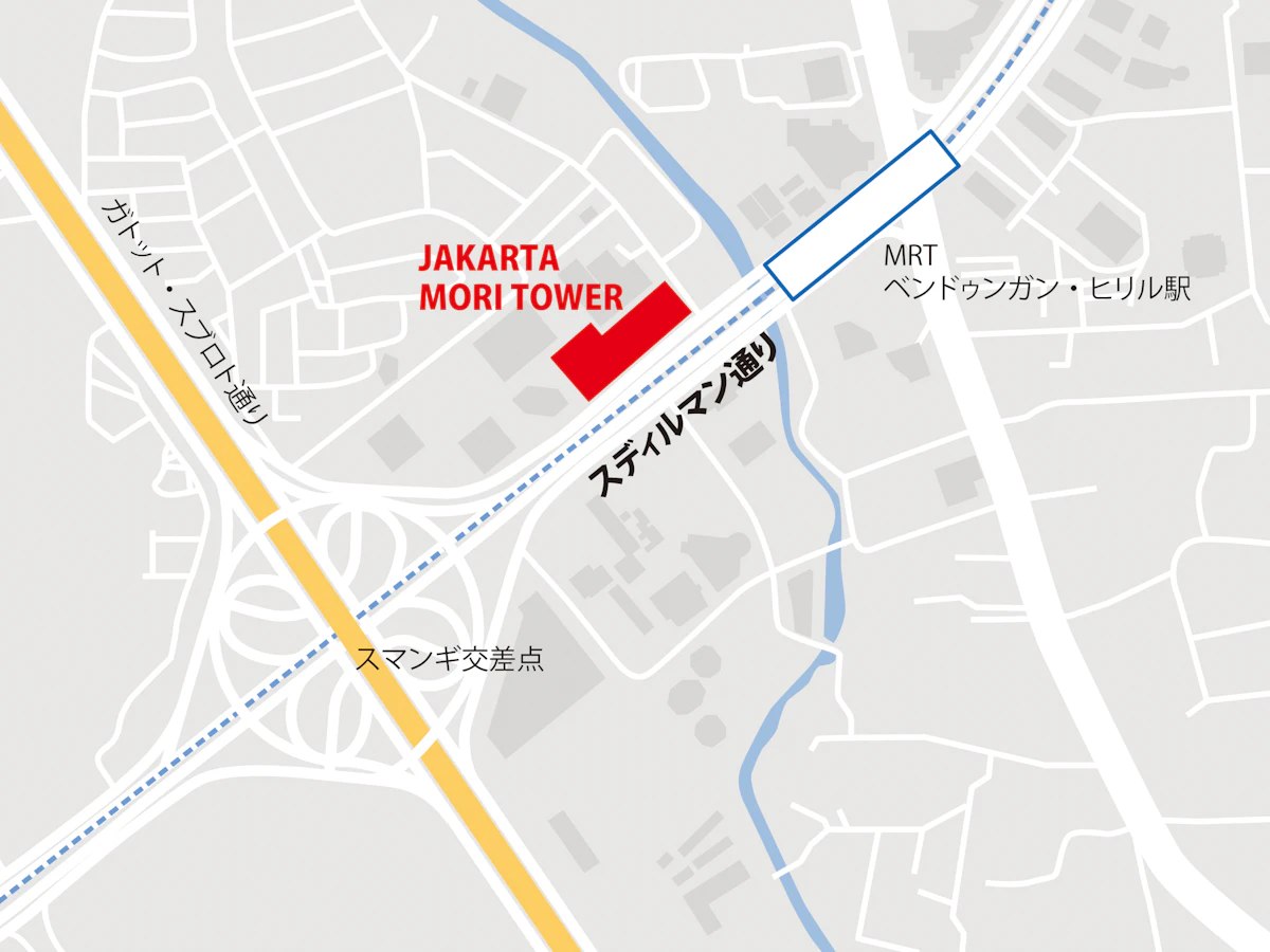 「JAKARTA MORI TOWER」は、高層ビルが集積するジャカルタ最大のビジネス街の中心部、目抜き通り・スディルマン通り沿いのスマンギ交差点近くに位置する、ジャカルタ最高水準のスペックを備えた大規模オフィスタワーです。