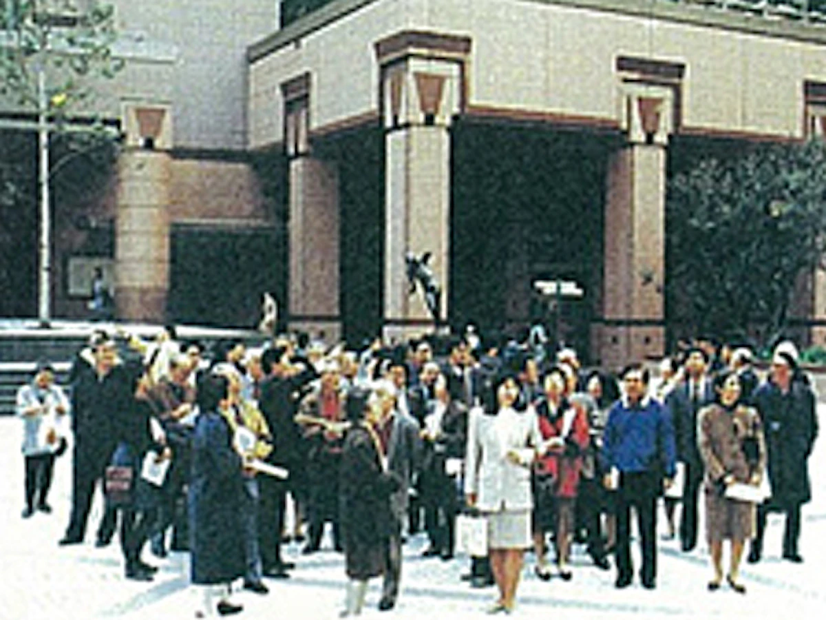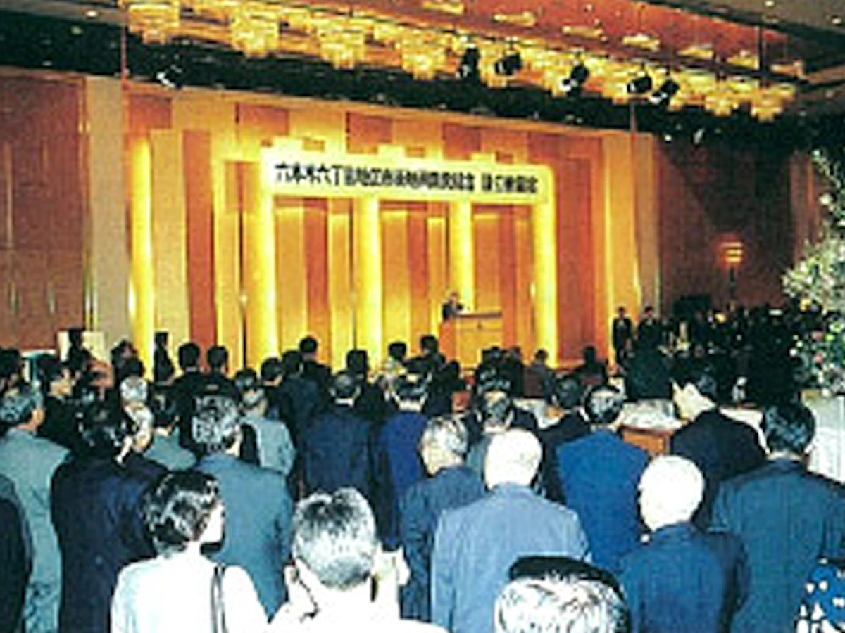その後の設立パーティには来賓、組合員約170名が出席、再開発事業に向けて新たなステップを踏み出そうという一体感を得て、会は盛況でありました。普段あまりパーティなどに顔を見せない森ビルの故森泰吉郎社長も車椅子で出席、「地域の皆様方との心と心が相通じ合う信頼関係を大事にし、最後の笑顔のために一生懸命がんばります。」と挨拶しました。