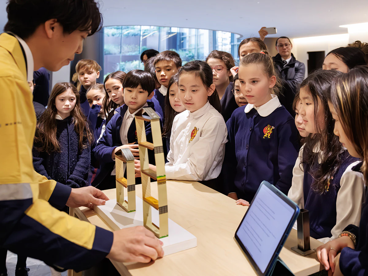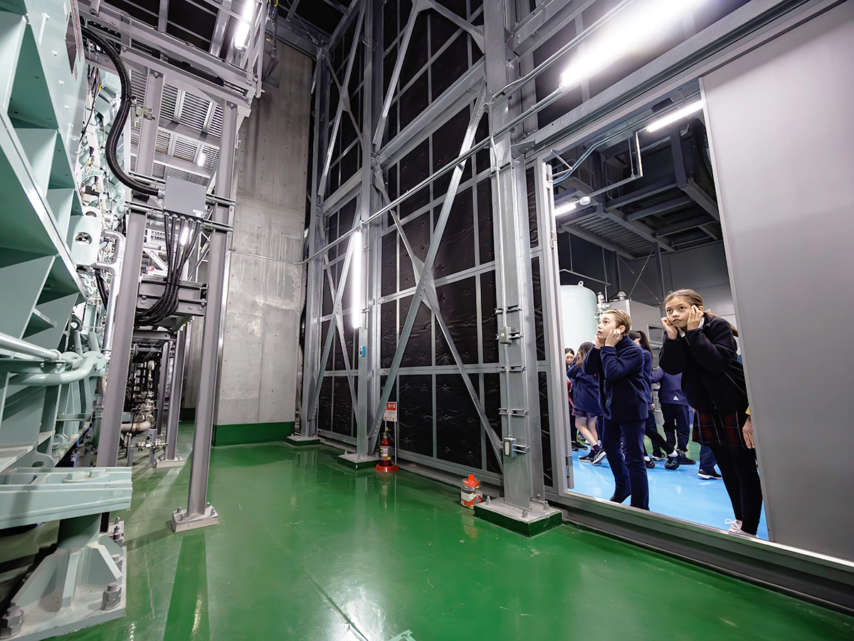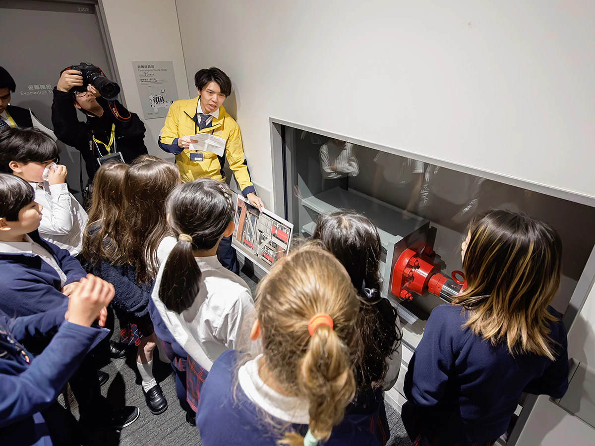 訓練では、生徒110名が、麻布台ヒルズで通常非公開の備蓄倉庫や制振装置、自家発電プラントを見学し、日本の地震の仕組みや超高層タワーの震災対策について学びました。