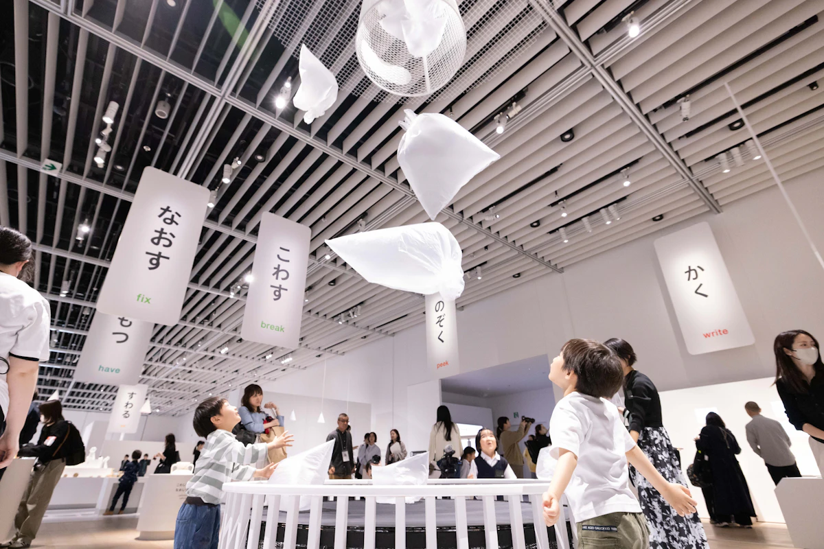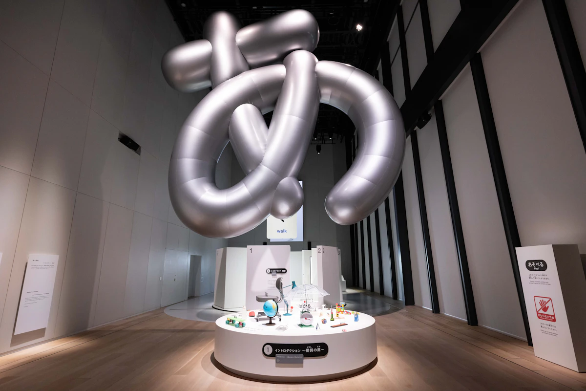 東京タワーの展望台を見下ろす地上 220 メートルに位置するTOKYO NODE のギャラリーで、約1,500㎡、最大高さ 15m のユニークな空間を使った大型展覧会。各展示室には「あるく」「たべる」「すわる」「もつ」などといった動詞ごとに、観察・考察・体験のステップで構成された 35 点の作品が並びます。